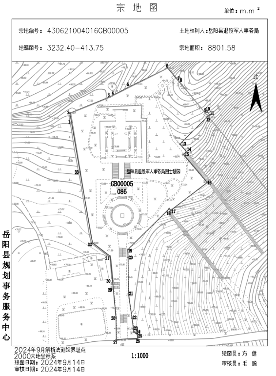 三、保護範圍:以嶽陽縣烈士陵園宗地圖(詳見附件1,宗地編號:430621004016GB00005,地籍圖號:3232.40-413.75)紅線基準線為基礎,東南側、南側以紅線基準線為界,東北側、西北側、西側以紅線基準線外延2米為界(詳見附件2),保護範圍的麵積為9375.93平方米。