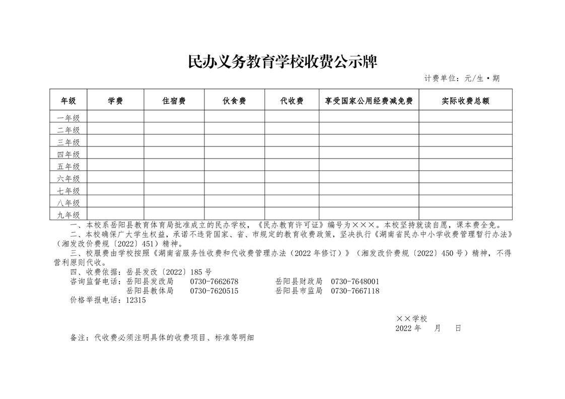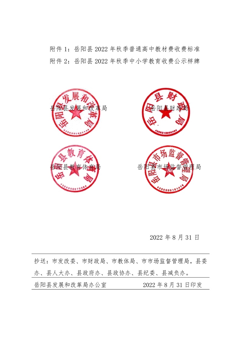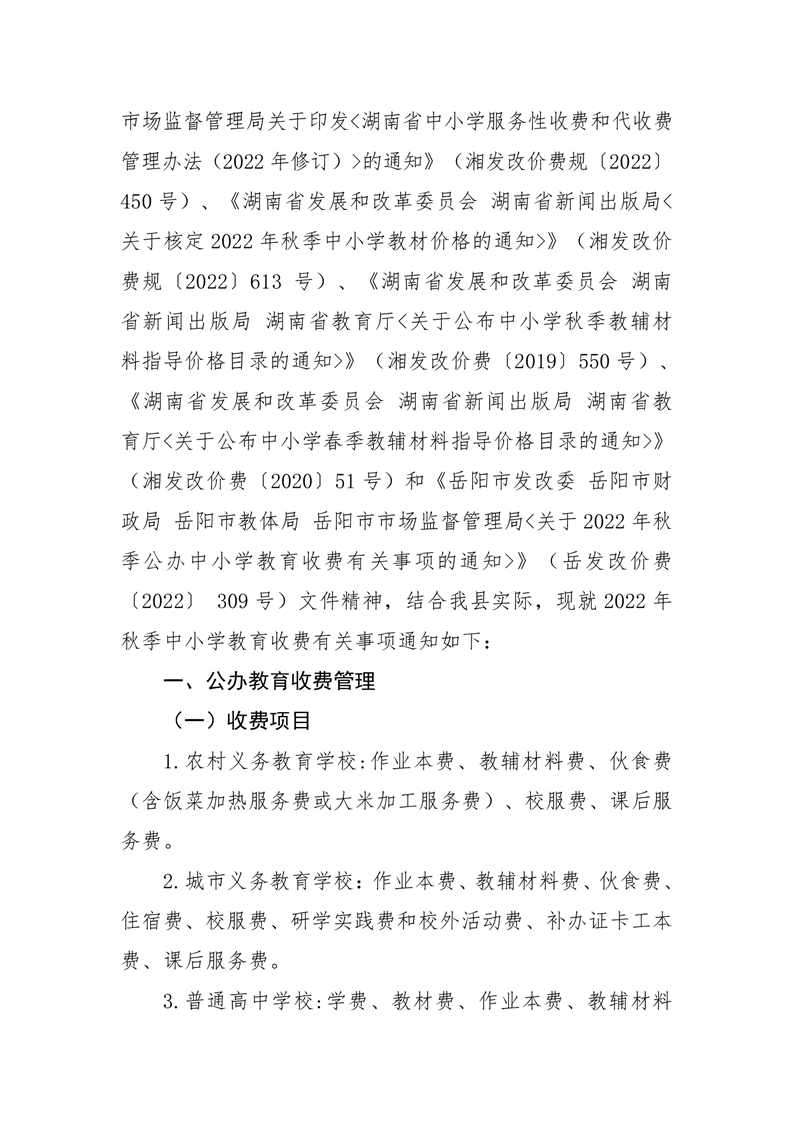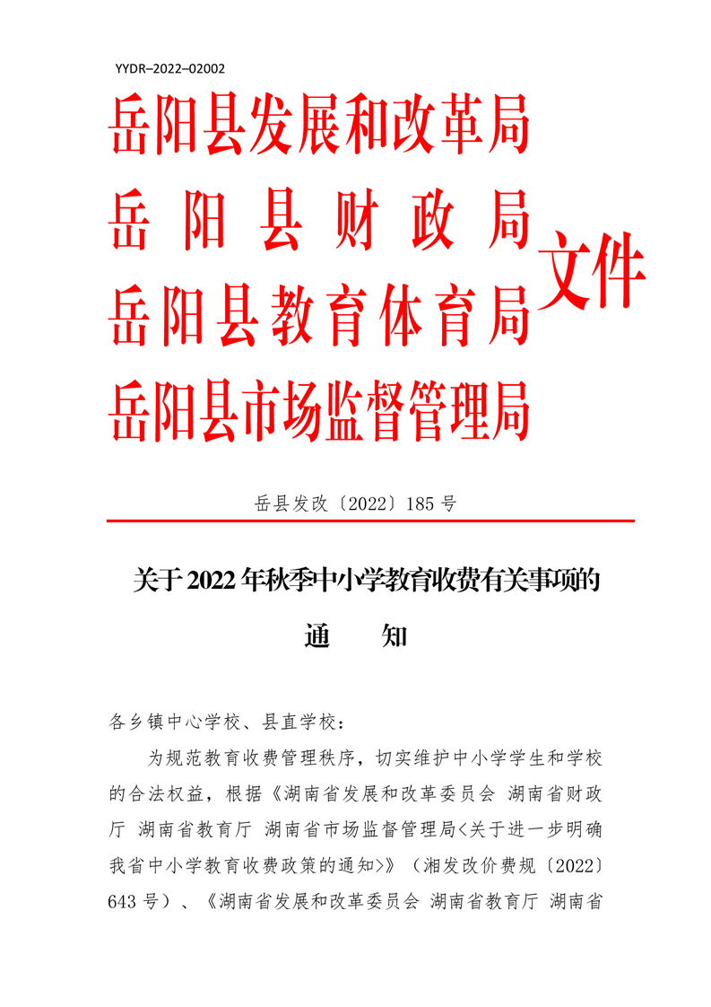 嶽陽縣發展和改革局 嶽陽縣財政局 嶽陽縣教育體育局 嶽陽縣市場監督管理局《關於2022年秋季中小學教育收費有關事項的通知》