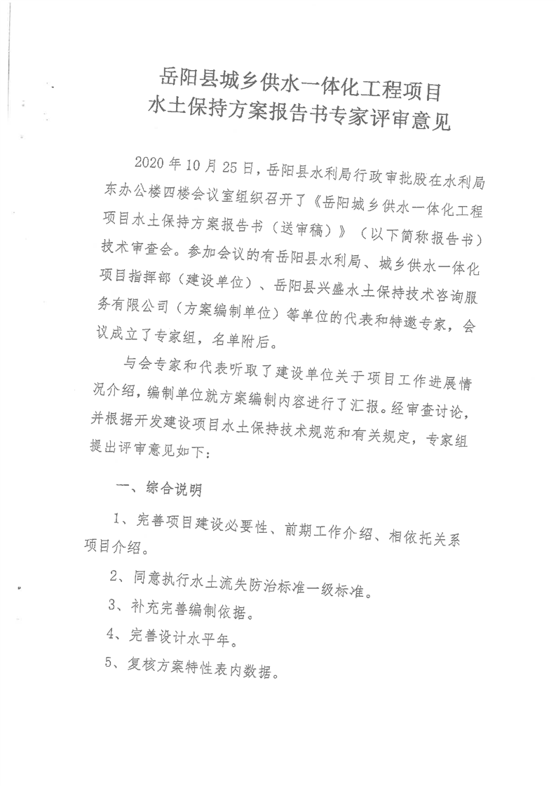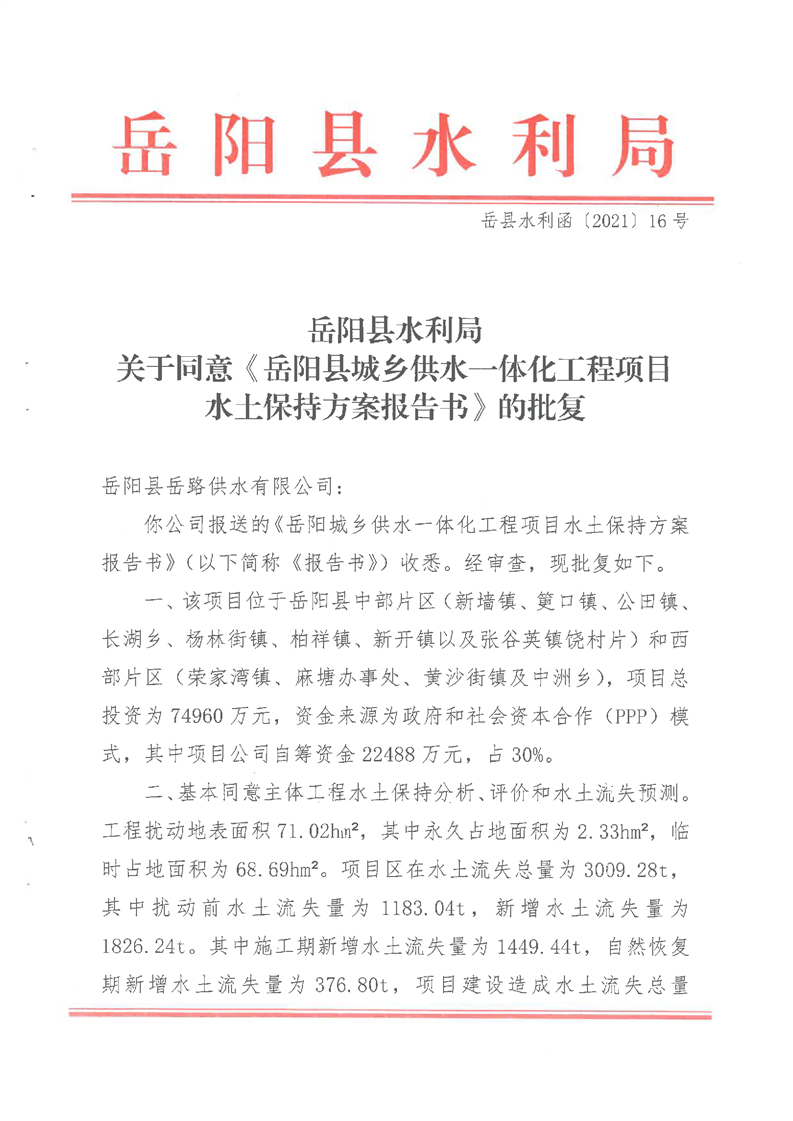 嶽陽縣水利局關於同意《嶽陽縣城鄉供水一體化工程項目水土保持方案報告書》的批複