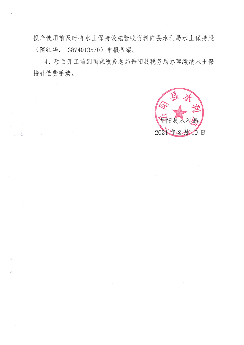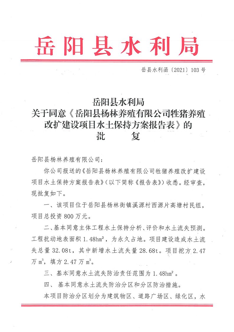 嶽陽縣水利局關於同意《嶽陽縣楊林養殖有限公司牲豬養殖改擴建設項目水土保持方案報告表》的批複