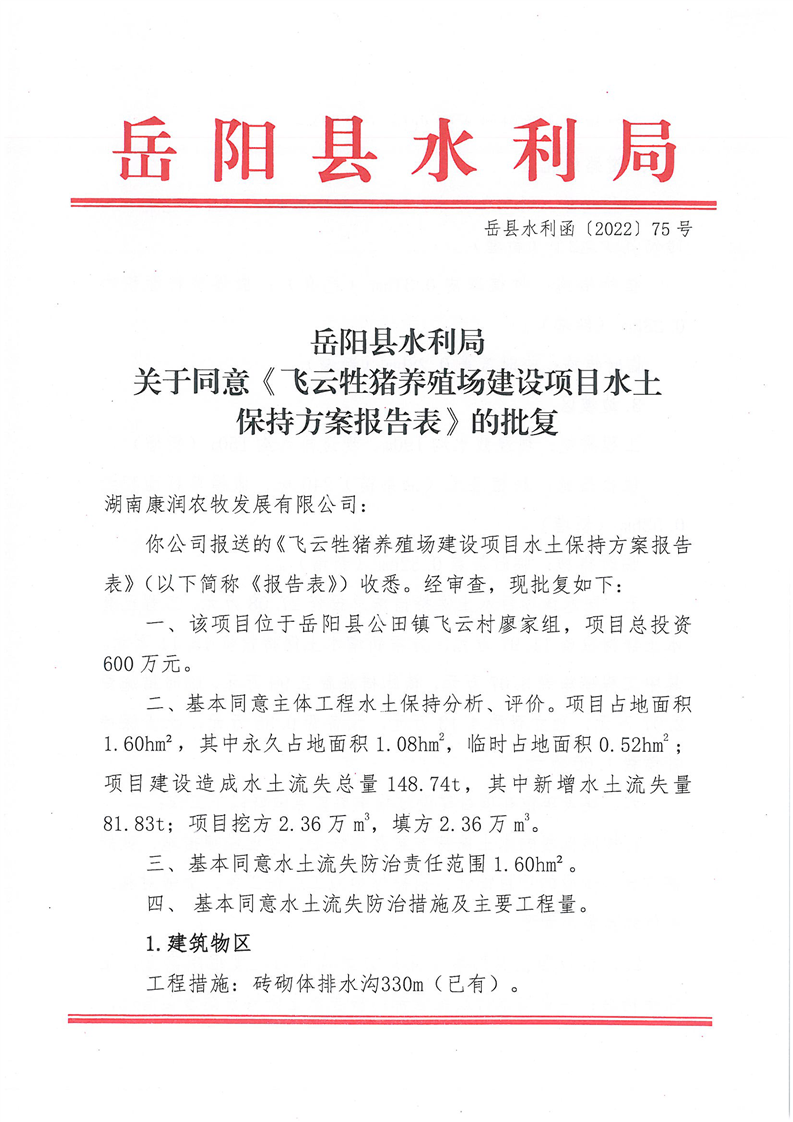 嶽陽縣水利局關於同意《飛雲牲豬養殖場建設項目水土保持方案報告表》的批複