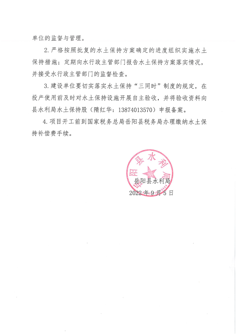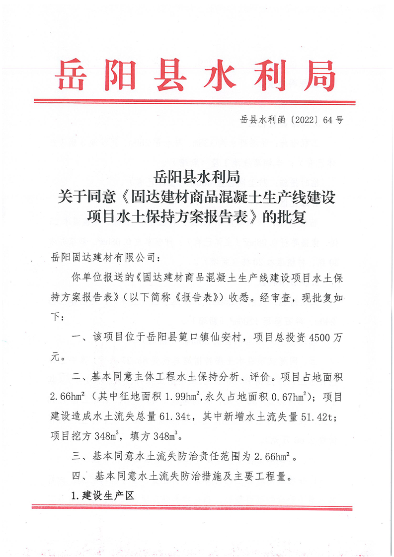 嶽陽縣水利局關於同意《固達建材商品混凝土生產線建設項目水土保持方案報告表》的批複