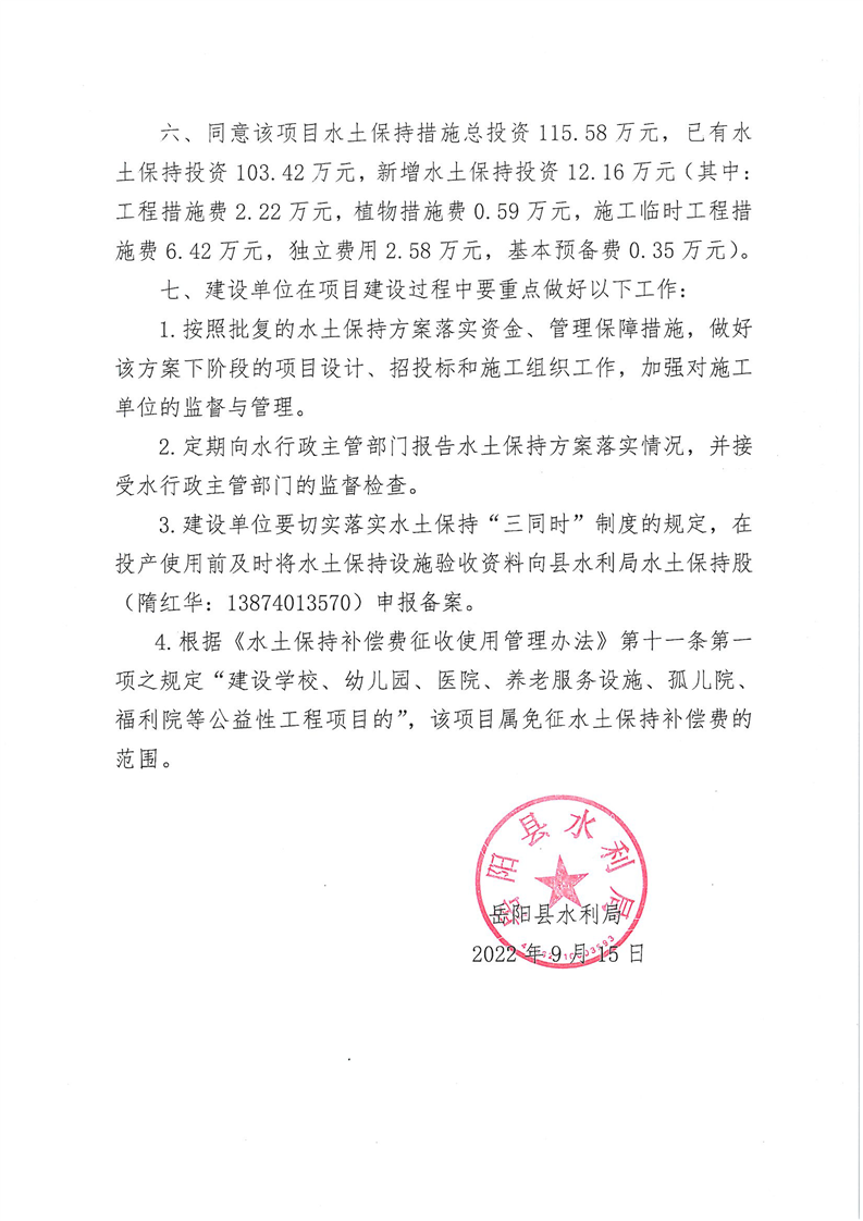 嶽陽縣水利局關於同意《嶽陽縣醫養健康園建設項目水土保持方案報告表》的批複