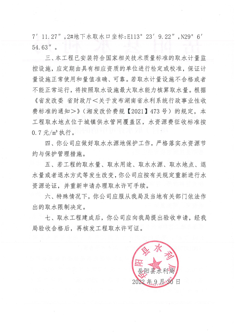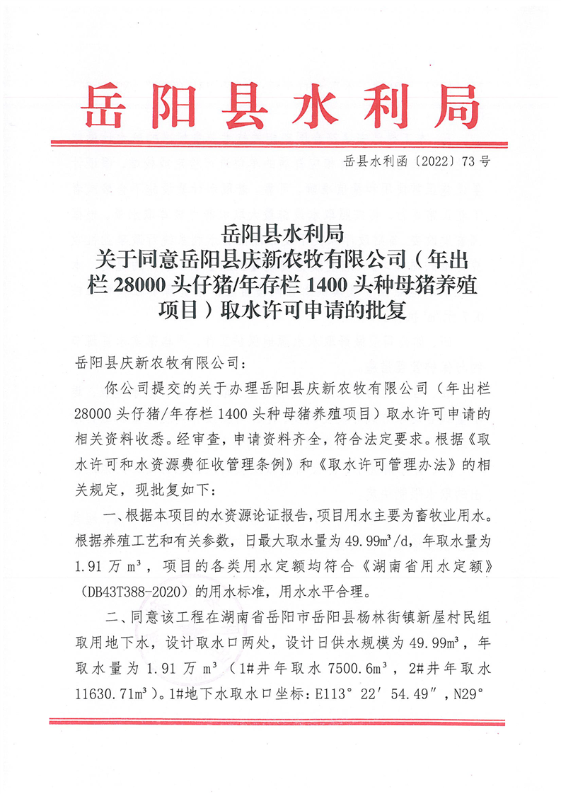 嶽陽縣水利局關於同意嶽陽縣慶新農牧有限公司(年出欄28000頭仔豬/年存欄1400頭種母豬養殖項目)取水許可申請的批複