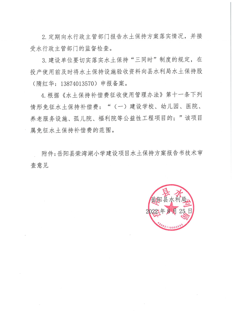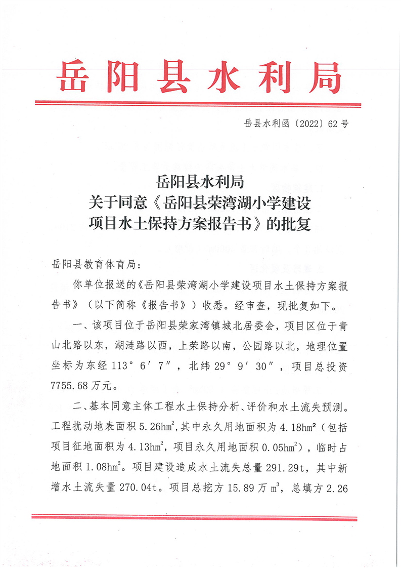 嶽陽縣水利局關於同意《嶽陽縣榮灣湖小學建設項目水土保持方案報告書》的批複