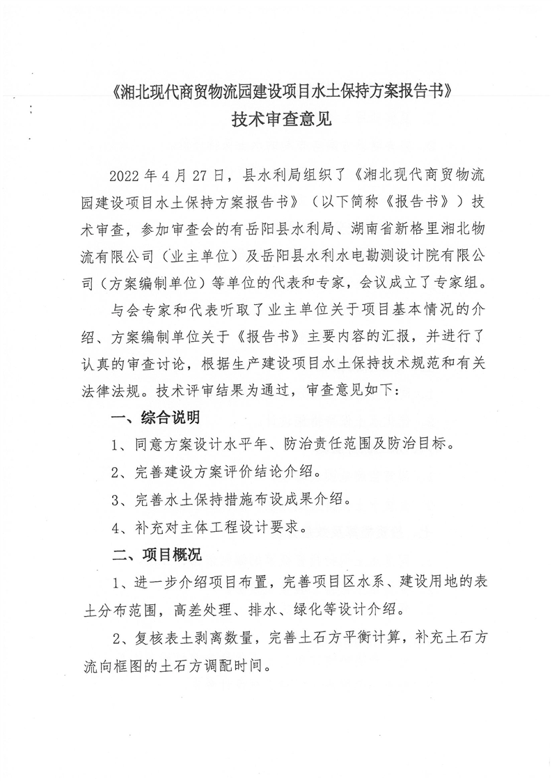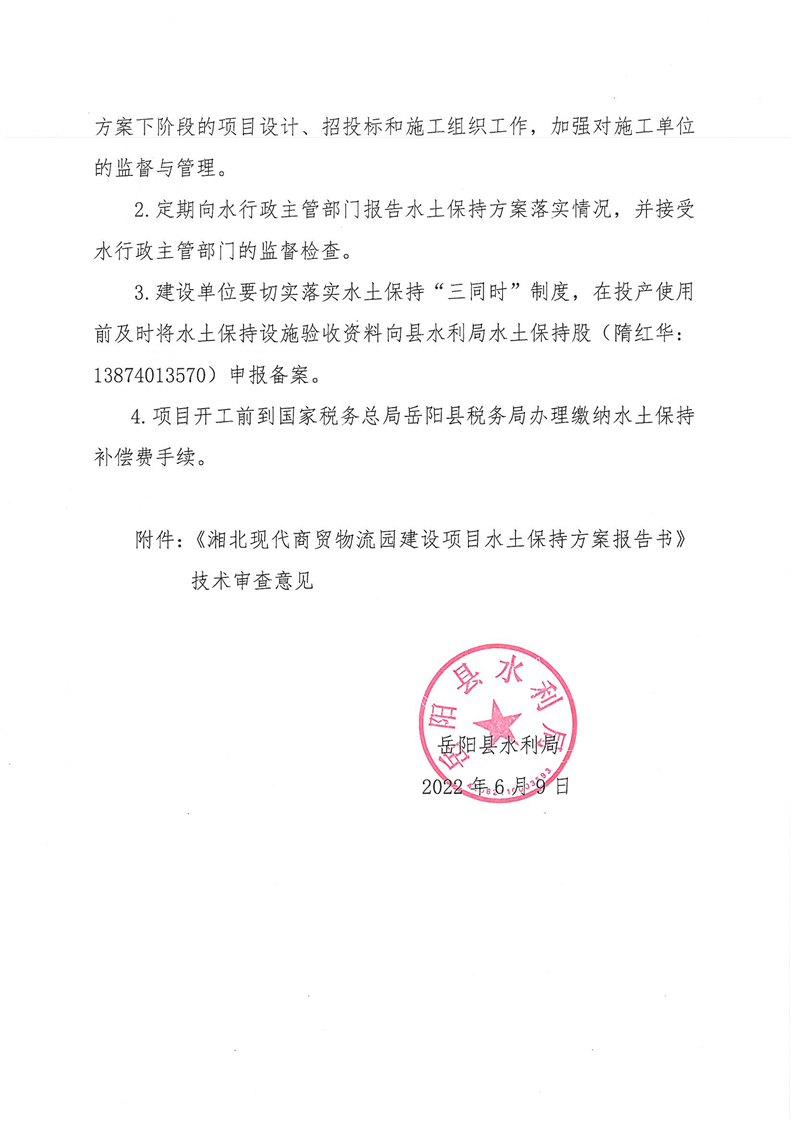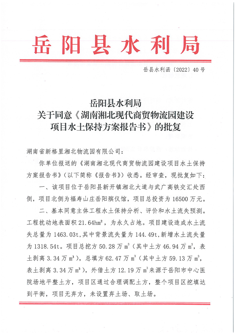 嶽陽縣水利局關於同意《湖南湘北現代商貿物流園建設項目水土保持方案報告書》的批複