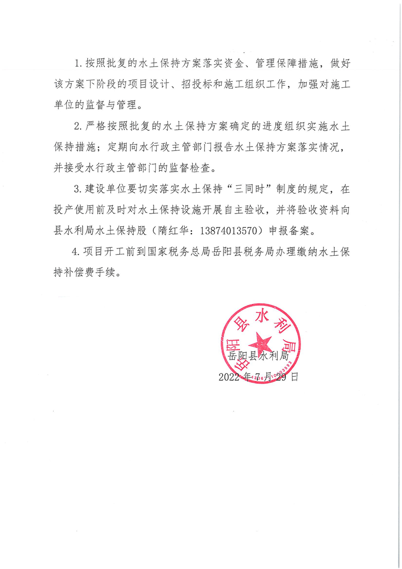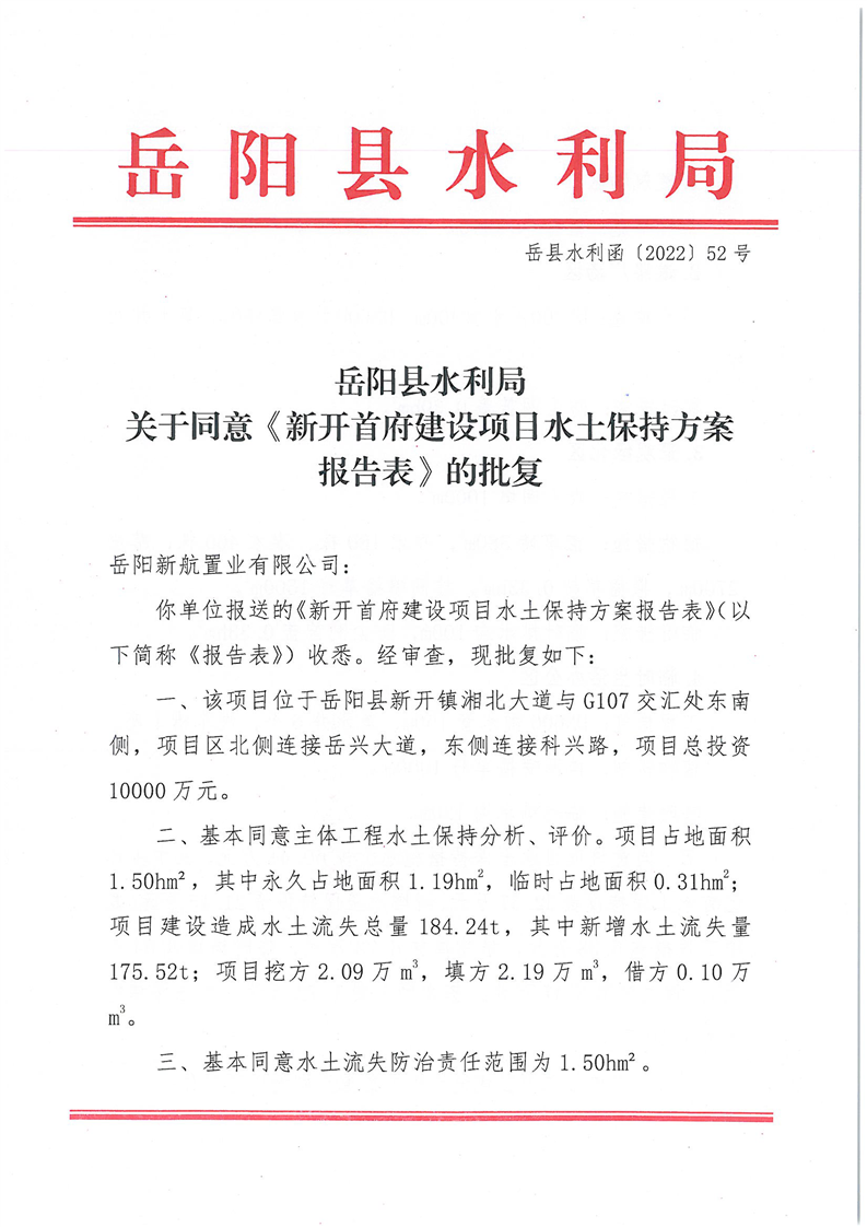 嶽陽縣水利局關於同意《新開首府建設項目水土保持方案報告表》的批複