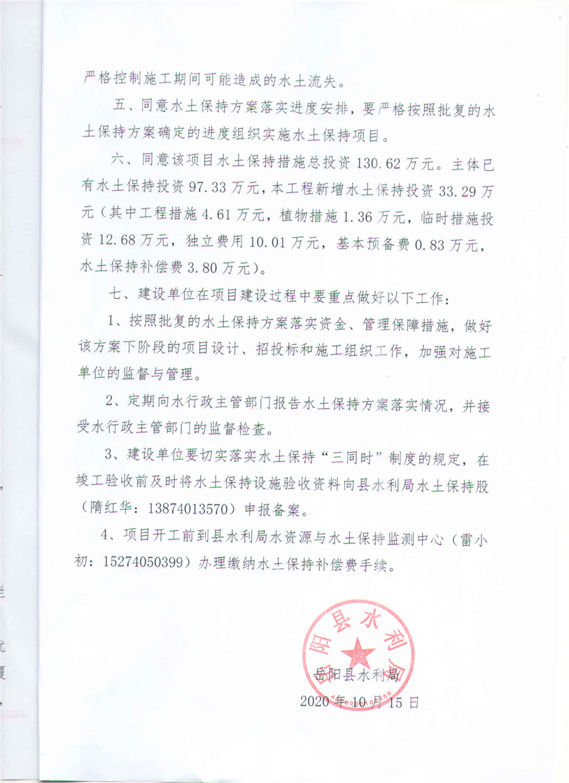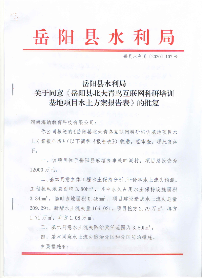 嶽陽縣水利局關於同意《嶽陽縣北大青鳥互聯網科研培訓基地項目水土保持方案報告表》的批複