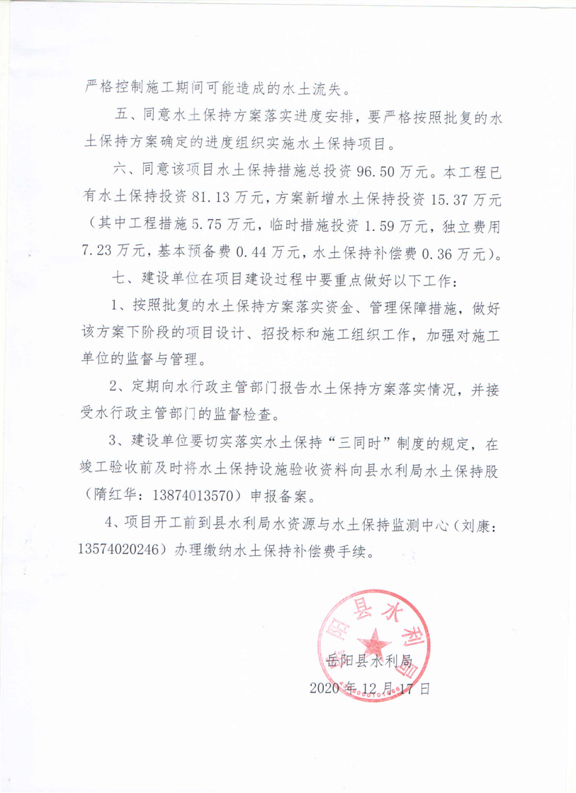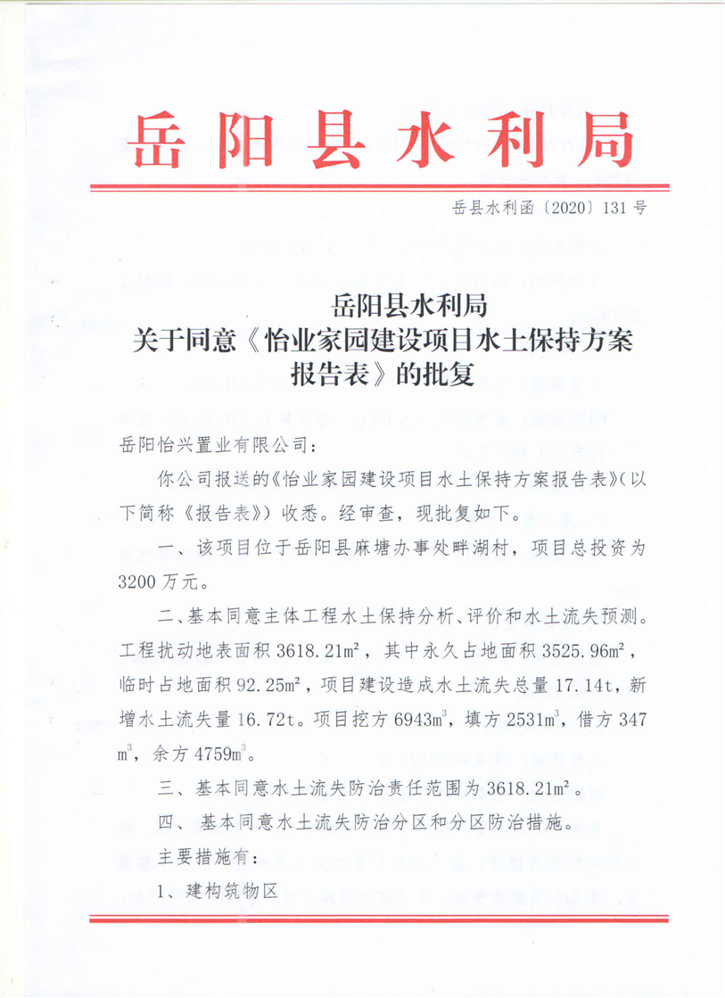 嶽陽縣水利局關於同意《怡業家園建設項目水土保持方案報告表》的批複