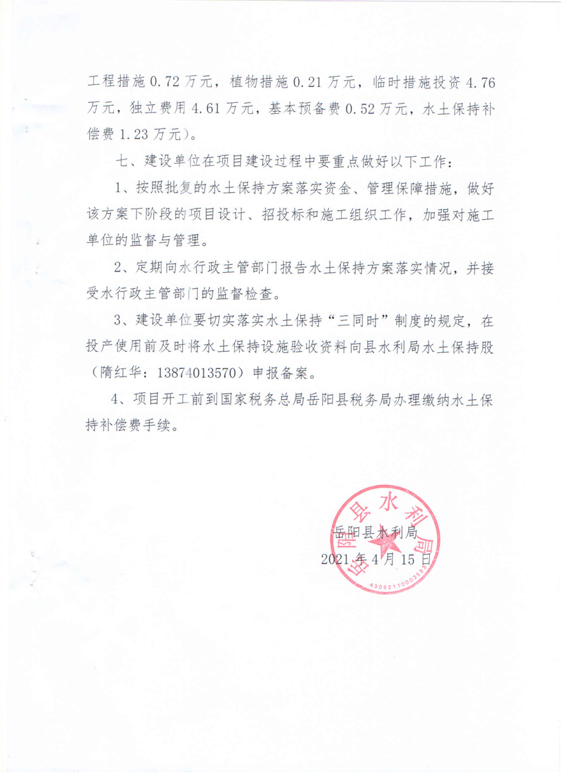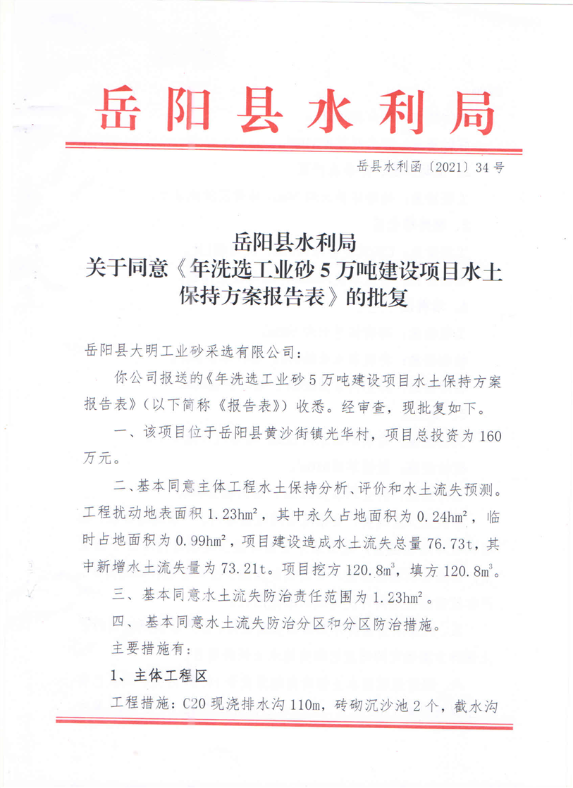 嶽陽縣水利局關於同意《年洗選工業砂5萬噸建設項目水土保持方案報告表》的批複