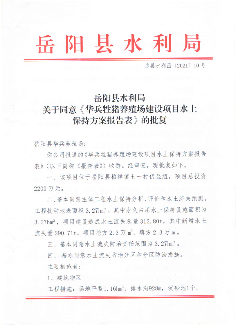 嶽陽縣水利局關於同意《華兵牲豬養殖場建設項目水土保持方案報告表》的批複