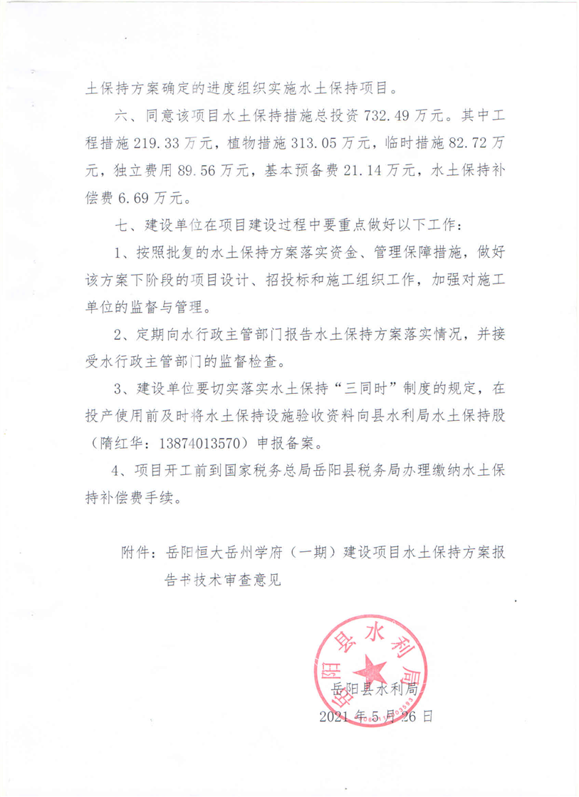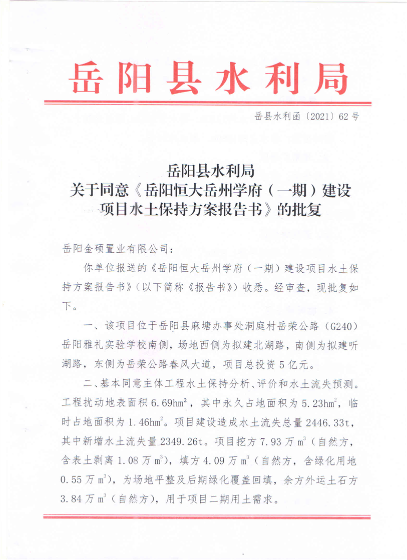 嶽陽縣水利局關於同意《嶽陽恒大嶽州學府(一期)建設項目水土保持方案報告書》的批複