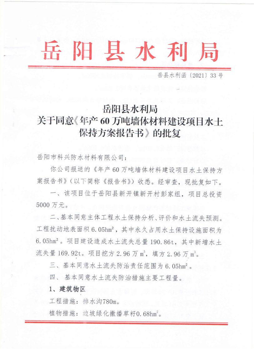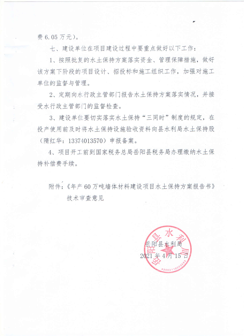 嶽陽縣水利局關於同意《年產60萬噸牆體材料建設項目水土保持方案報告書》的批複