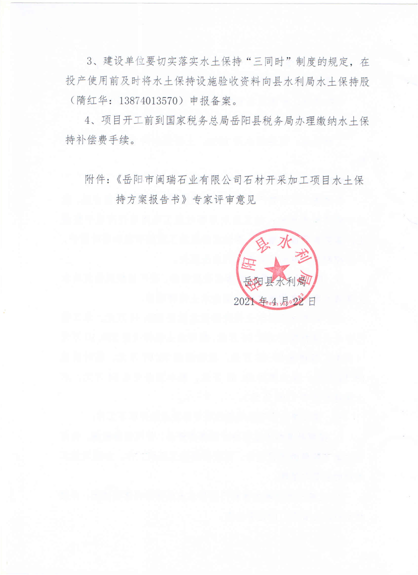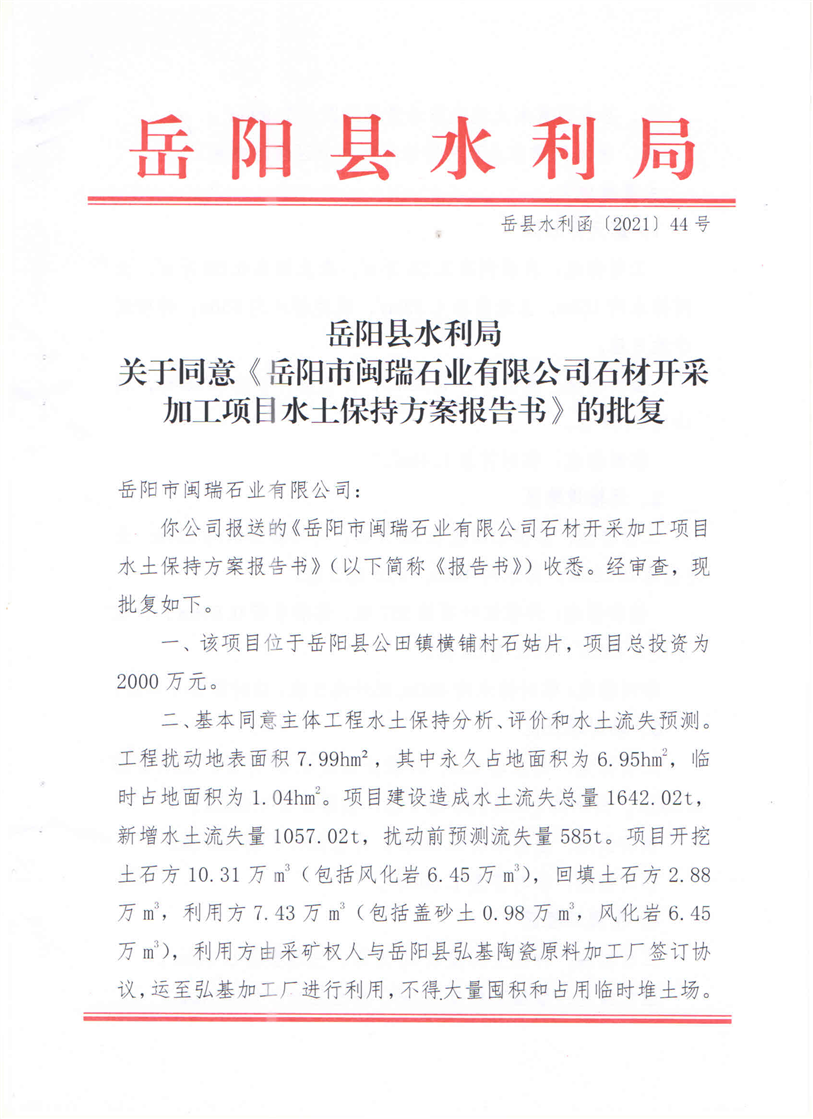 嶽陽縣水利局關於同意《嶽陽市閩瑞石業有限公司石材開采加工項目水土保持方案報告書》的批複