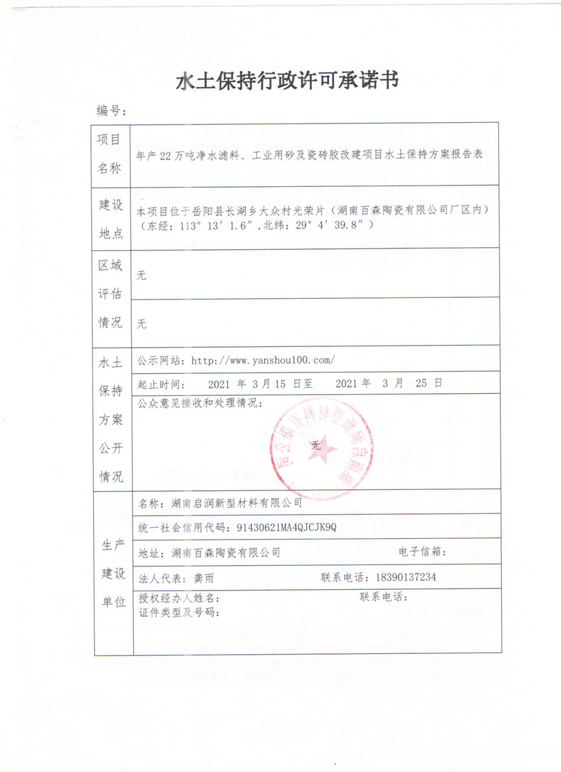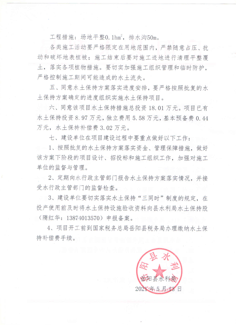 嶽陽縣水利局關於同意《年產22萬噸淨水濾料、工業用砂及瓷磚膠改建項目水土保持方案報告表》的批複