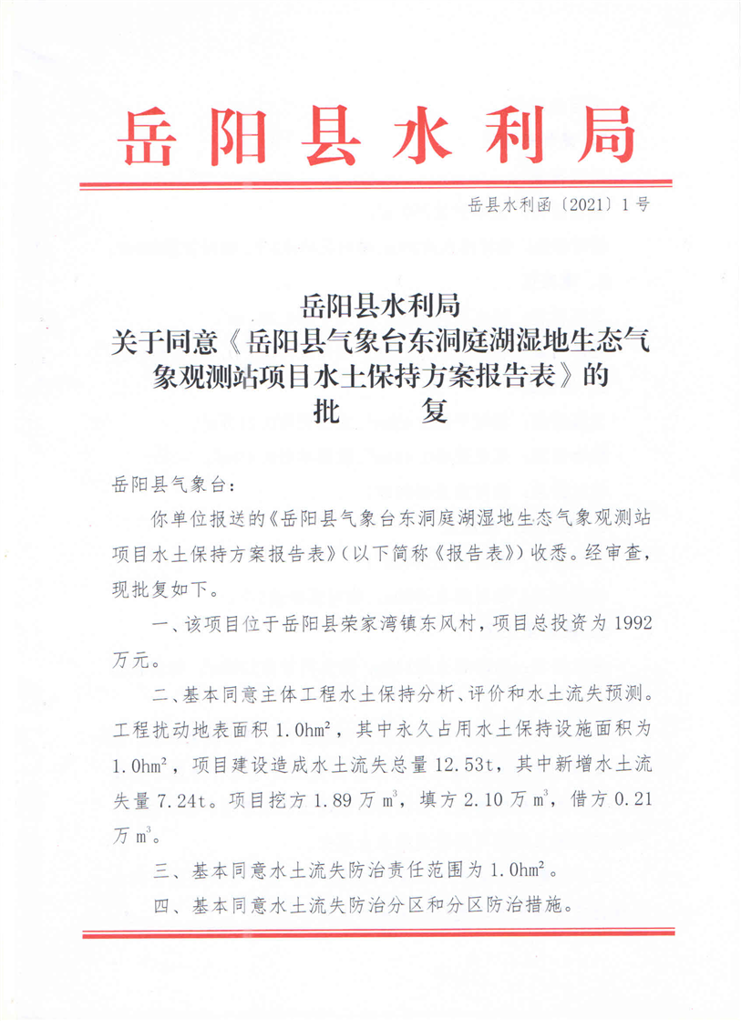 嶽陽縣水利局關於同意《嶽陽縣氣象台東洞庭湖濕地生態氣象觀測站項目水土保持方案報告表》的批複