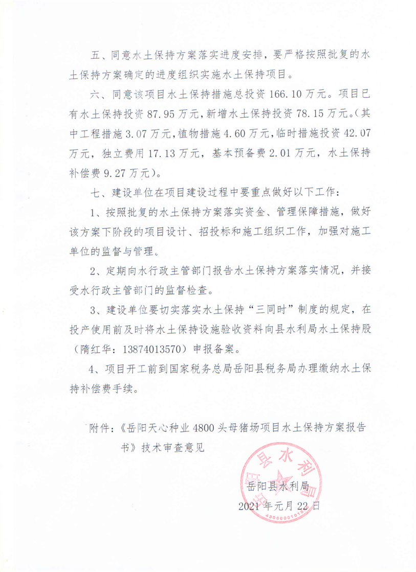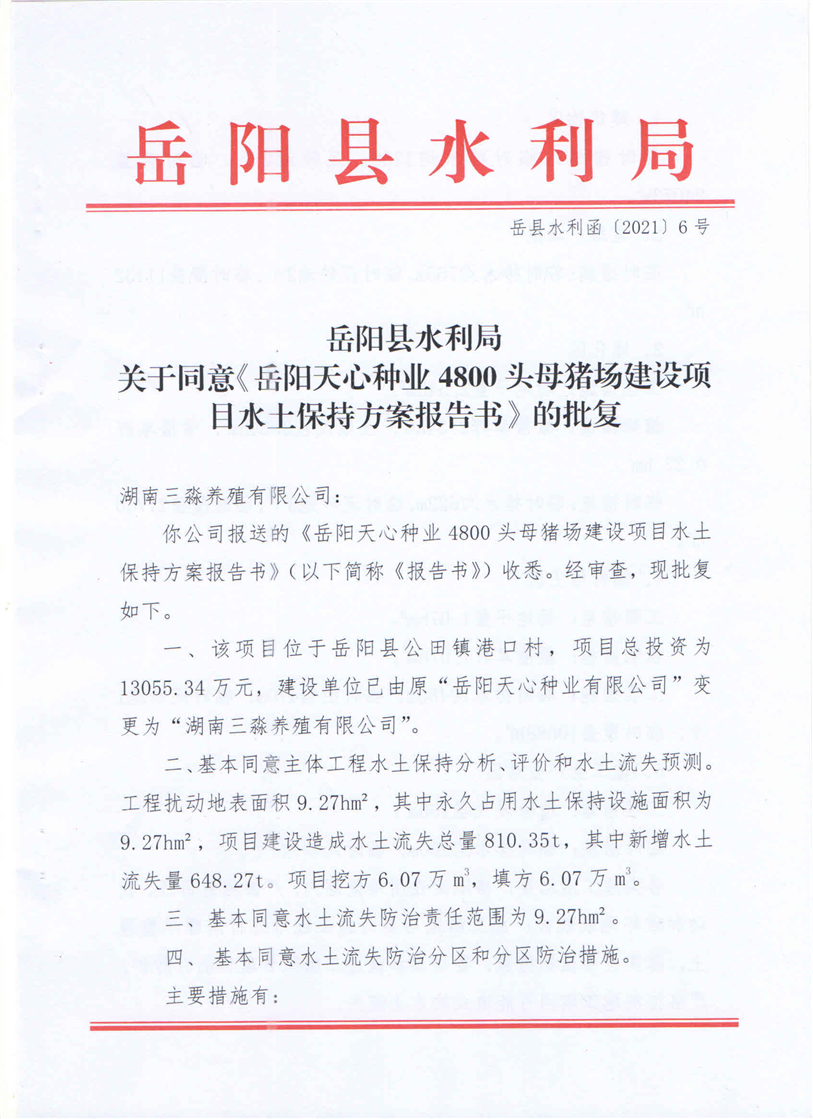 嶽陽縣水利局關於同意《嶽陽天心種業4800頭母豬場建設項目水土保持方案報告書》的批複