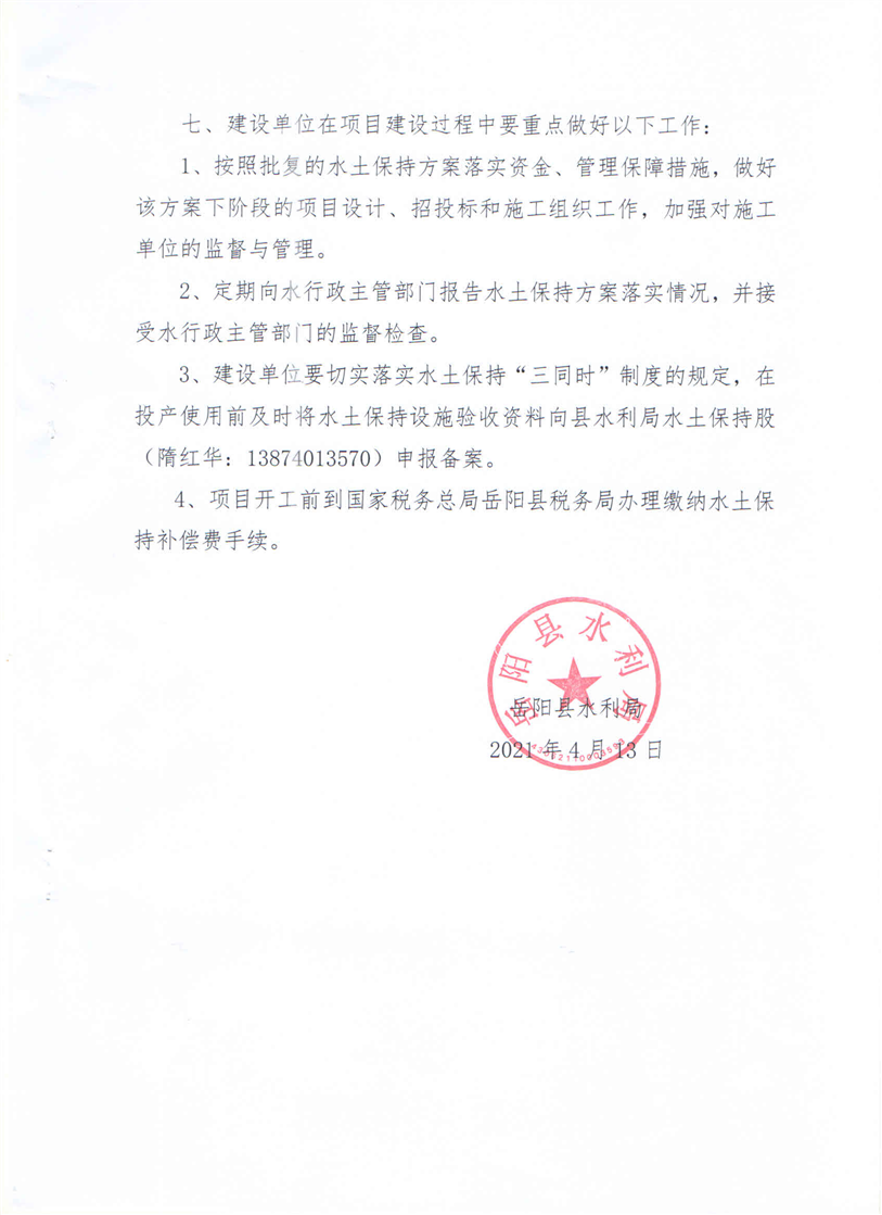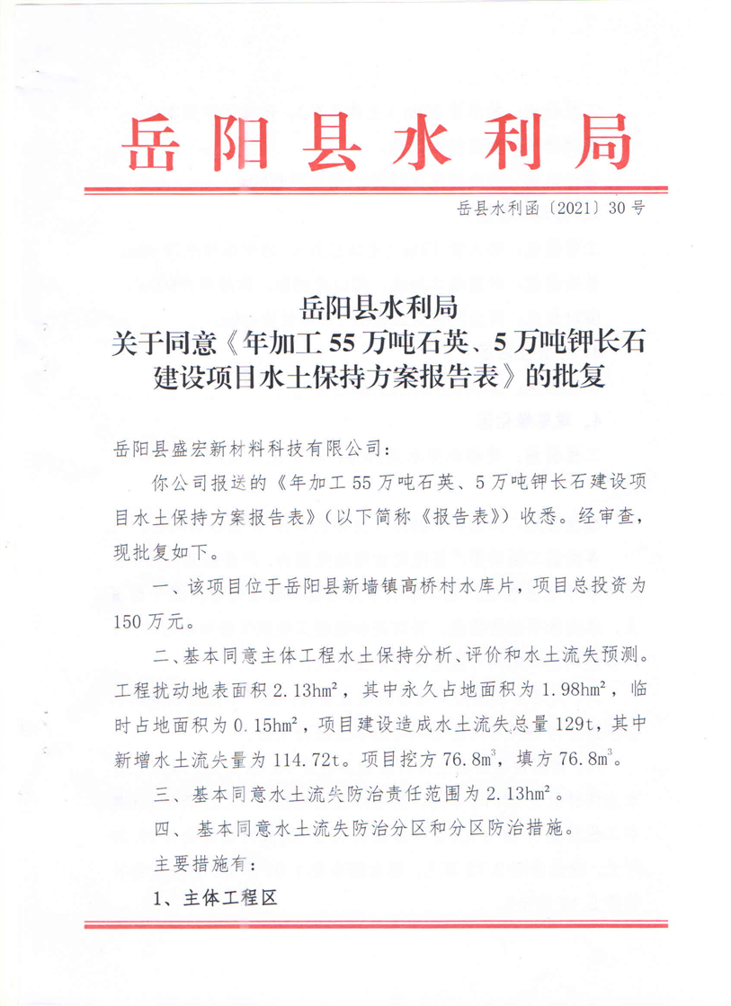 嶽陽縣水利局關於同意《年加工55萬噸石英、5萬噸鉀長石建設項目水土保持方案報告表》的批複