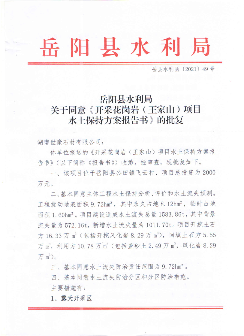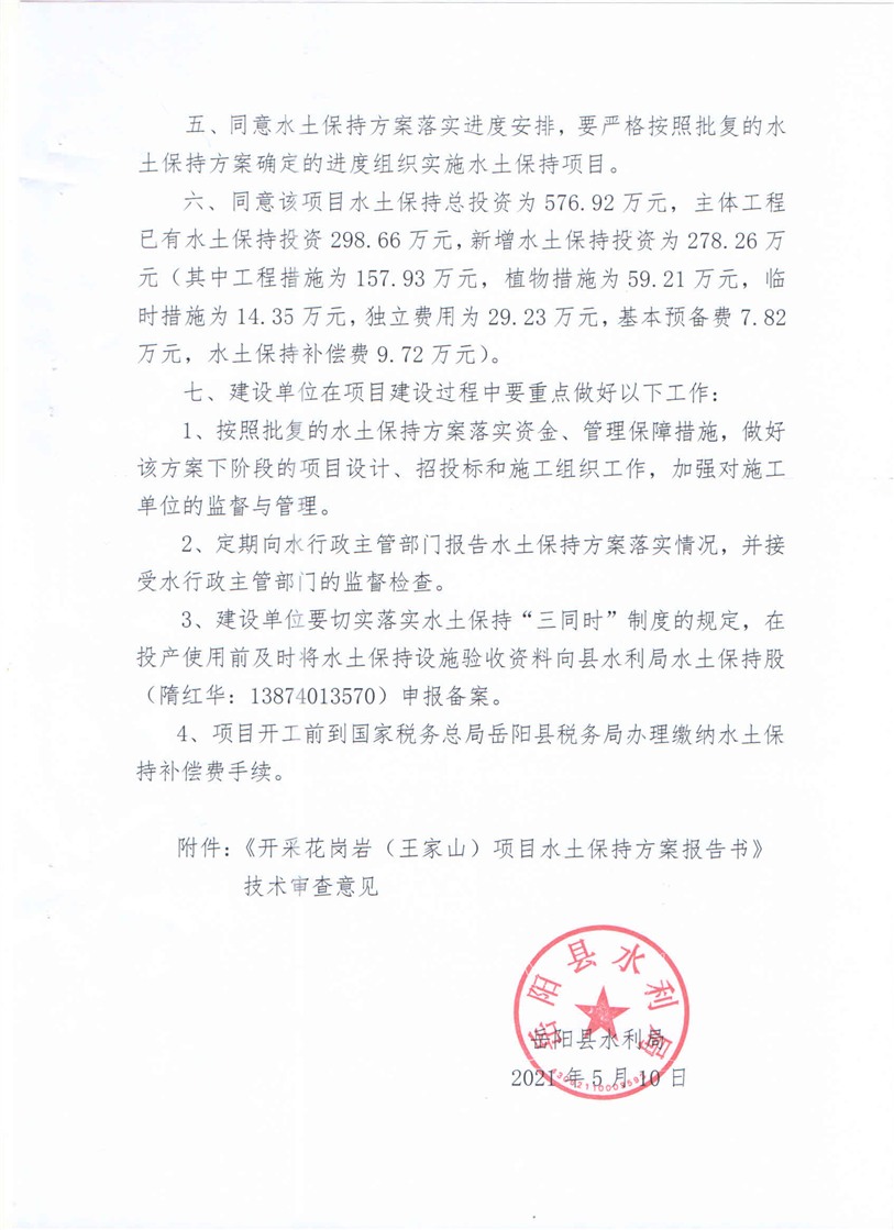 嶽陽縣水利局關於同意《開采花崗岩(王家山)項目水土保持方案報告書》的批複