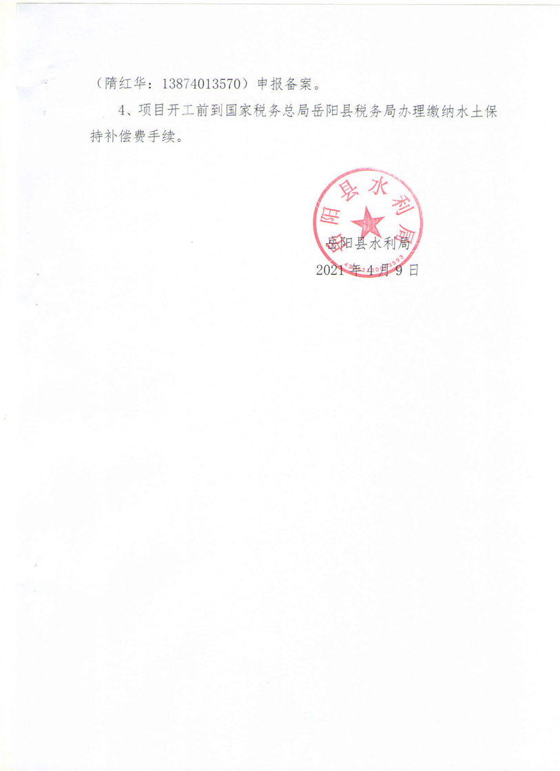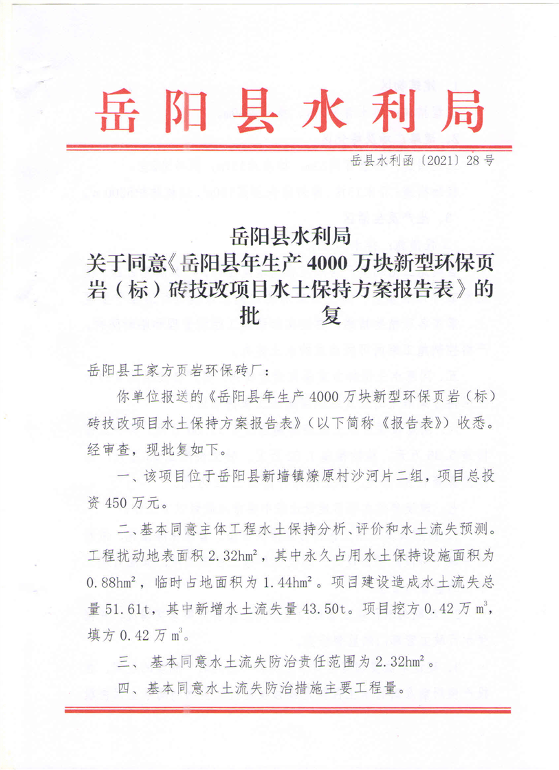 嶽陽縣水利局關於同意《嶽陽縣年生產4000萬塊新型環保頁岩(標)磚技改項目水土保持方案報告表》的批複