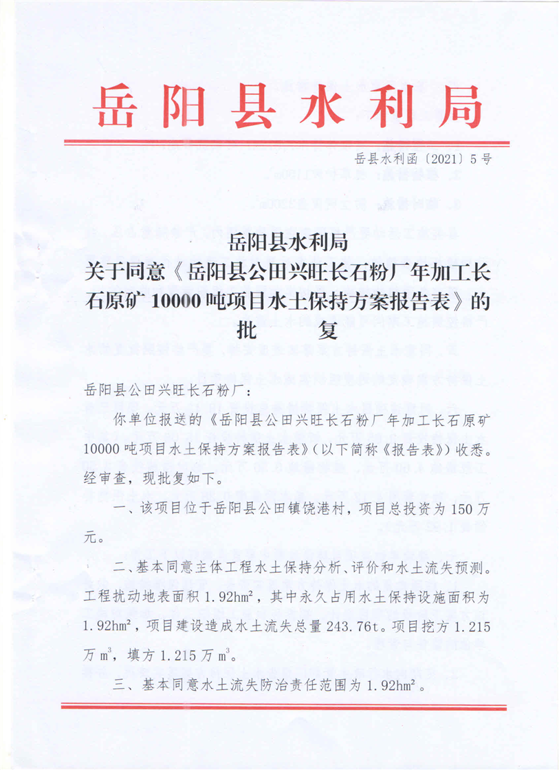 嶽陽縣水利局關於同意《嶽陽縣公田興旺長石粉廠年加工長石原礦10000噸項目水土保持方案報告表》的批複