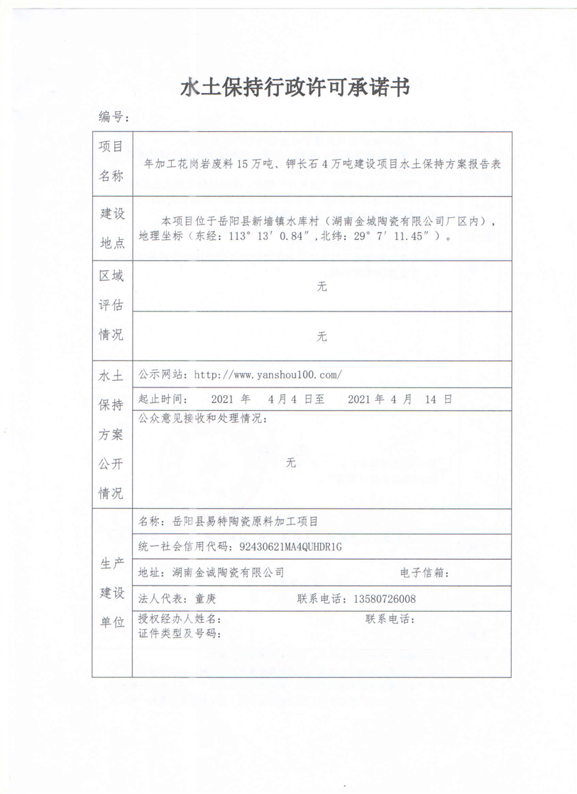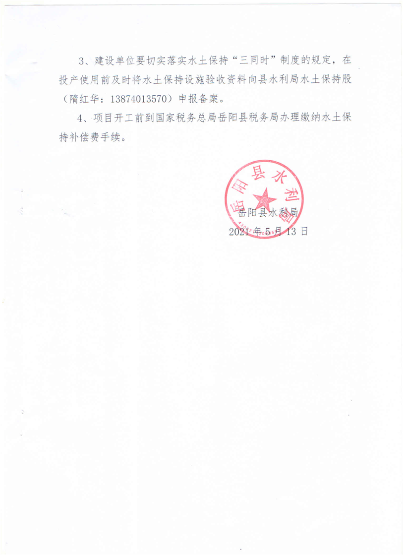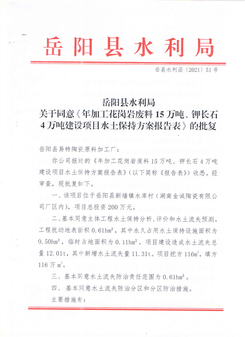 嶽陽縣水利局關於同意《年加工花崗岩廢料15萬噸、鉀長石4萬噸建設項目水土保持方案報告表》的批複