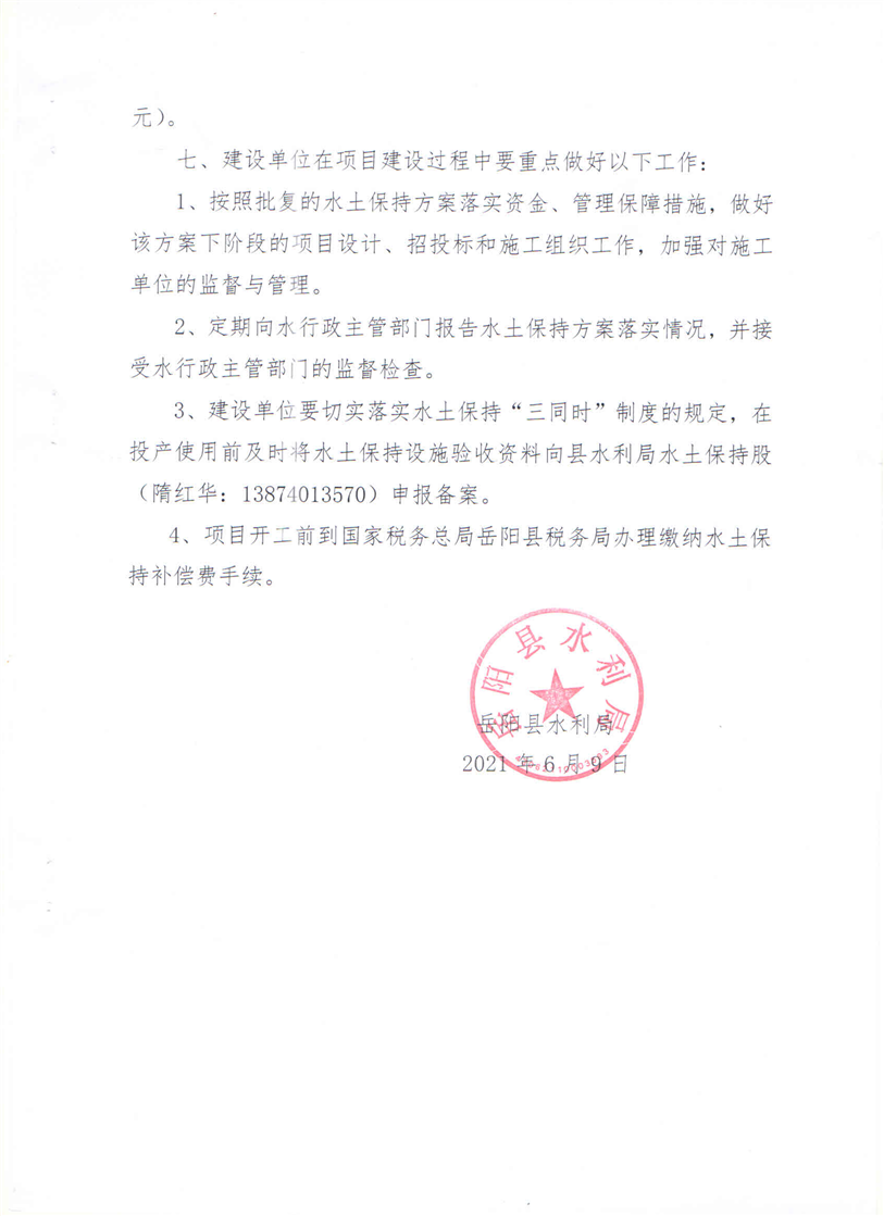 嶽陽縣水利局關於同意《嶽陽衛藍礦石加工有限公司嶽陽縣分公司年加工30萬噸廢石料建設項目水土保持方案報告表》的批複