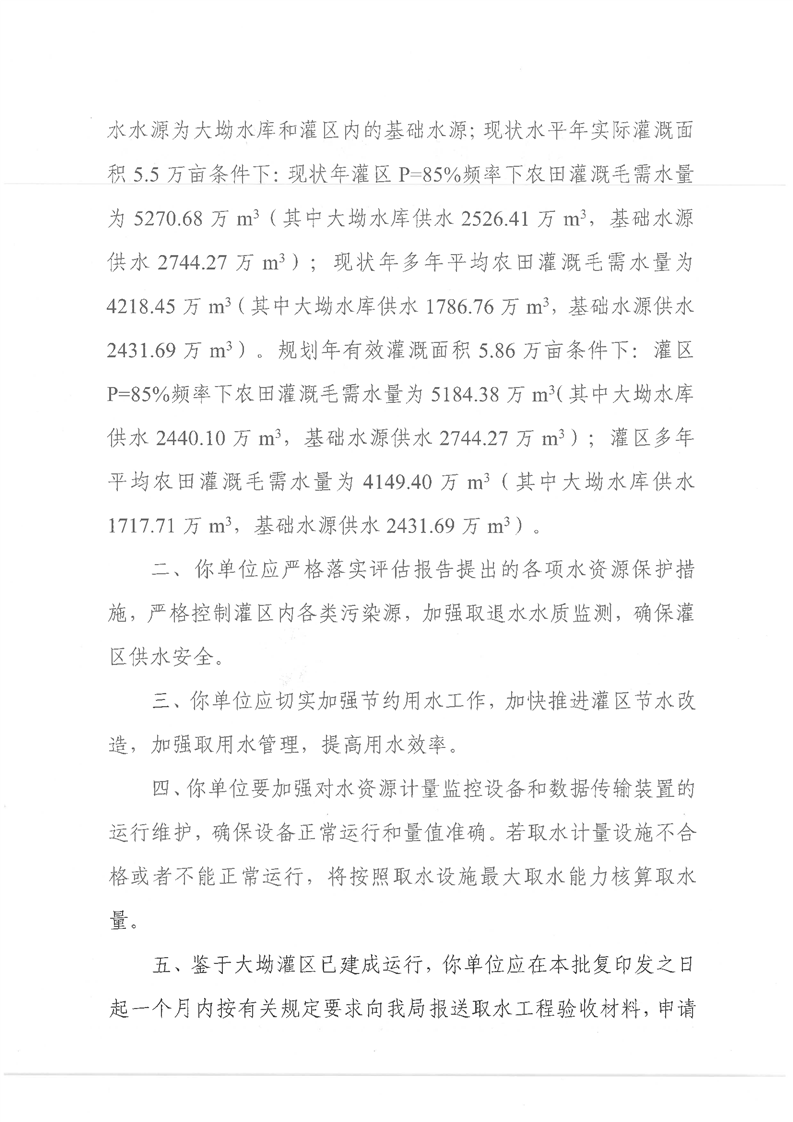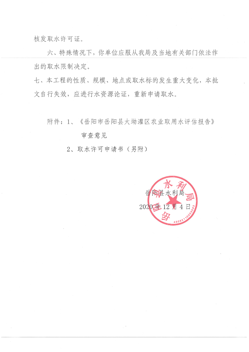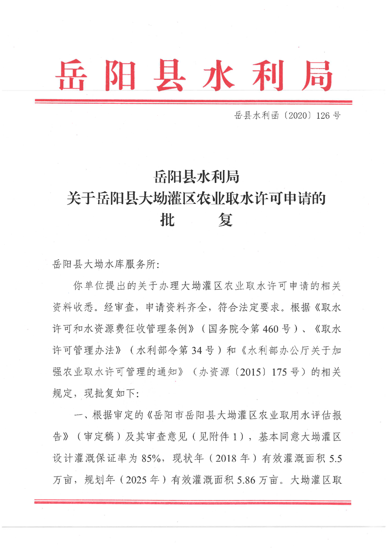 嶽陽縣水利局關於嶽陽縣大坳灌區農業取水許可申請的批複