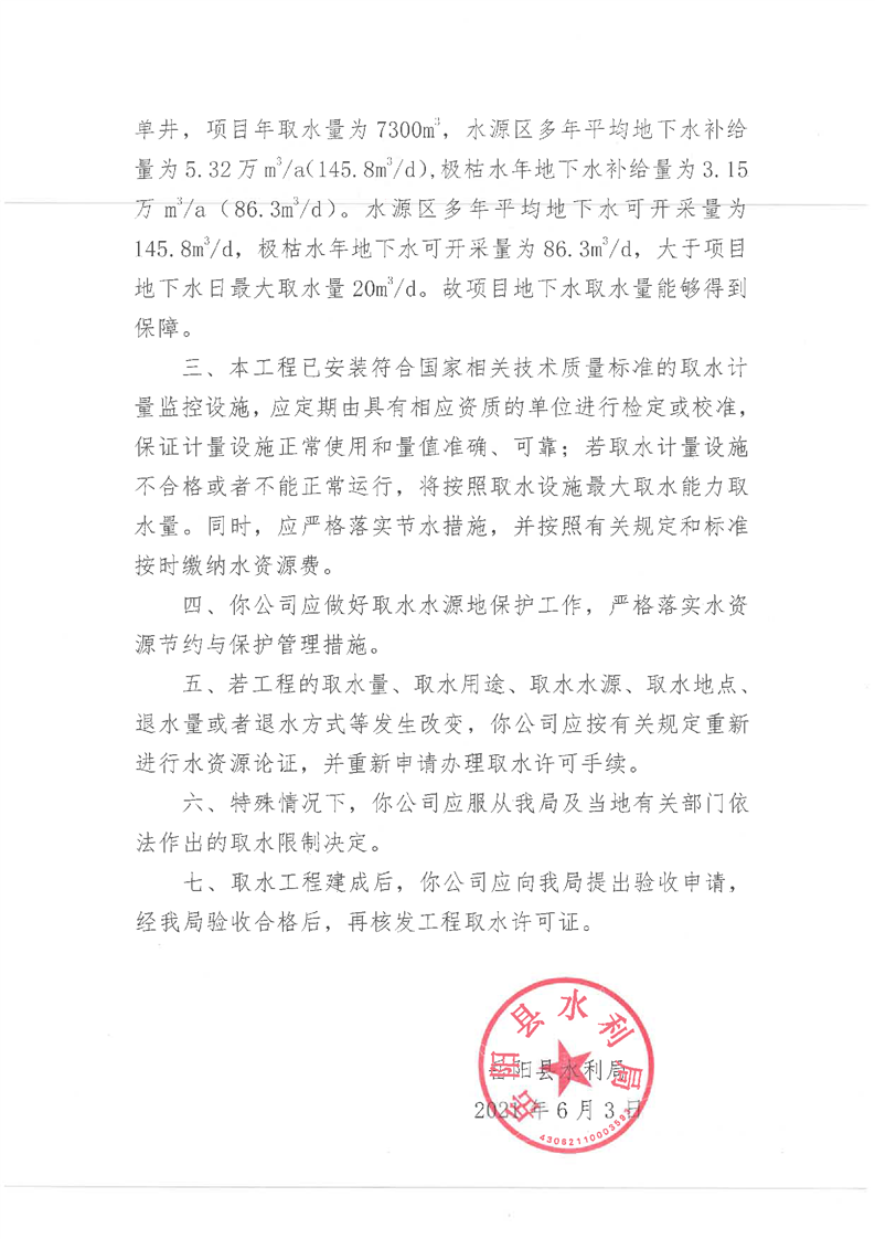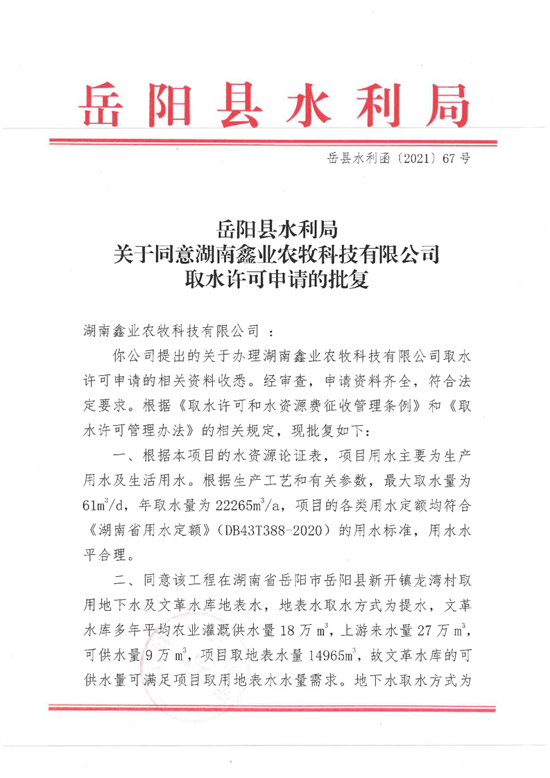 嶽陽縣水利局關於同意湖南鑫業農牧科技有限公司取水許可申請的批複2