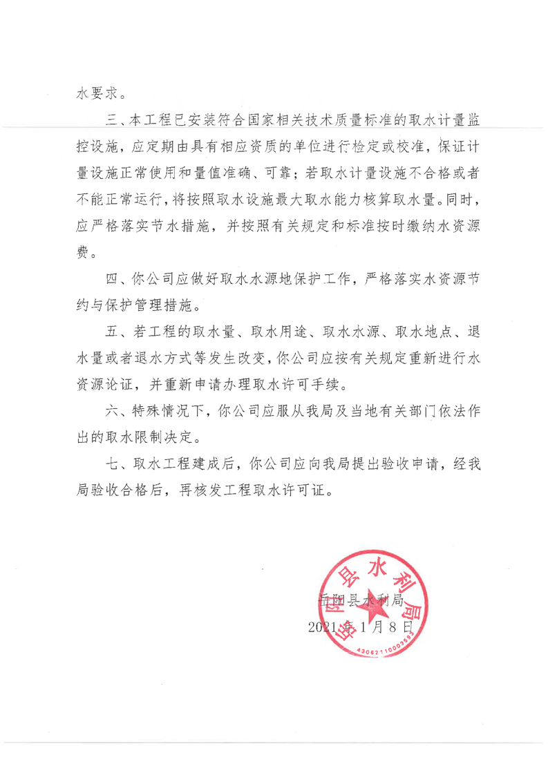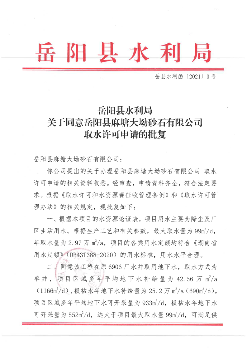 嶽陽縣水利局關於同意嶽陽縣麻塘大坳砂石有限公司取水許可申請的批複