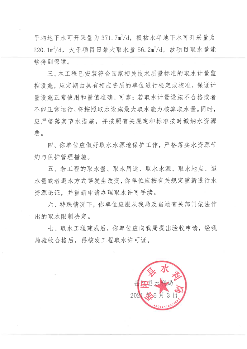 嶽陽縣水利局關於同意嶽陽縣王家方頁岩環保磚廠取水許可申請的批複
