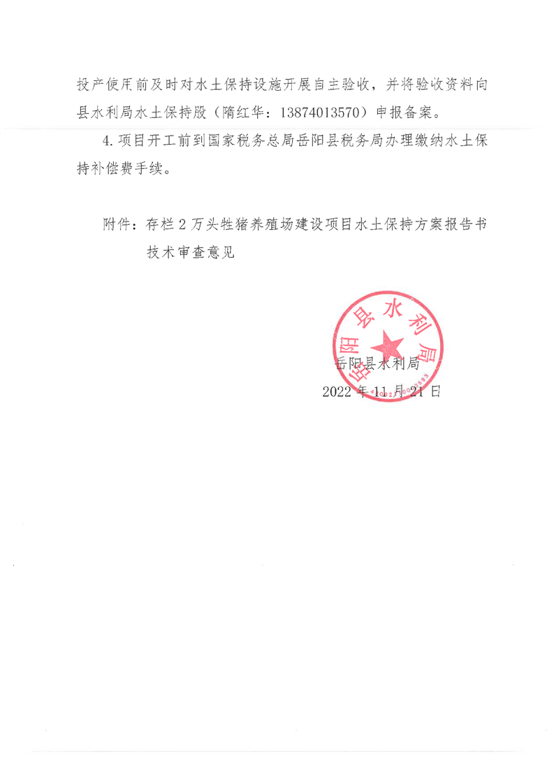 嶽陽縣水利局關於同意《存欄2萬頭牲豬養殖場建設項目水土保持方案報告書》的批複