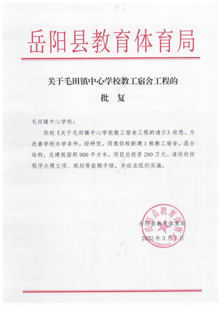 你校《關於毛田鎮中心學校教工宿舍工程的請示》收悉。為改善學校辦學條件,經研究,同意你校新建1棟教工宿舍,混合結構,總建築麵積900平方米,項目總投資280萬元。請你校按程序辦理立項、規劃等前期手續,並依法組織實施。