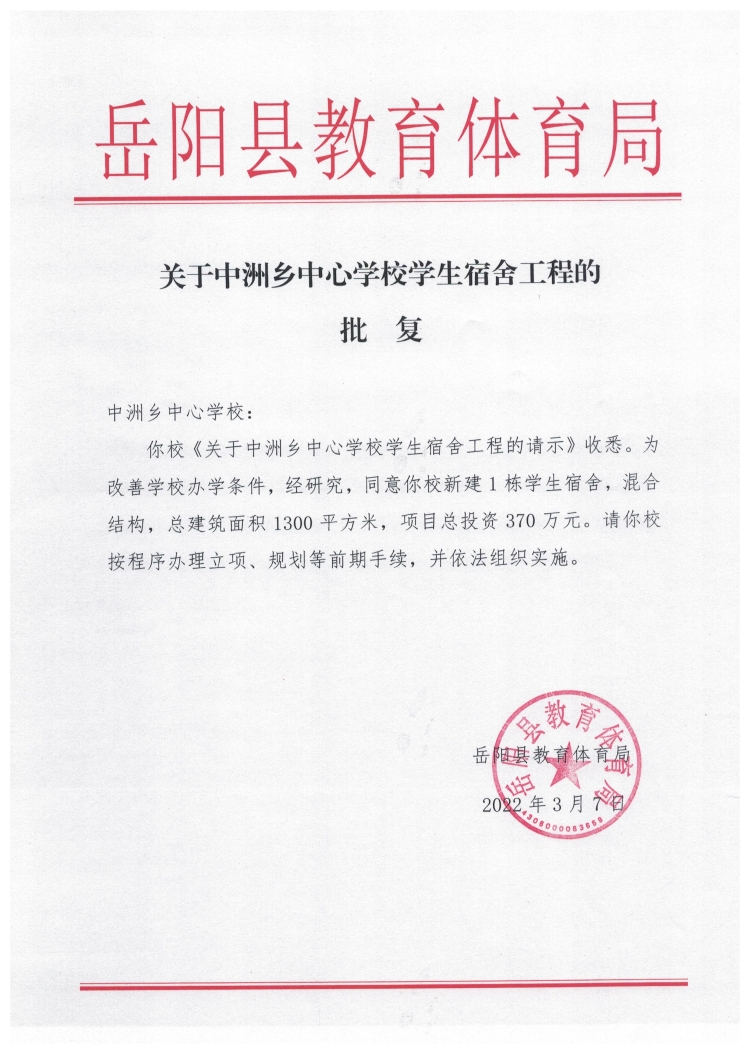 你校《關於中洲鄉中心學校學生宿舍工程的請示》收悉。為改善學校辦學條件,經研究,同意你校新建1棟學生宿舍,混合結構,總建築麵積1300平方米,項目總投資370萬元。請你校按程序辦理立項、規劃等前期手續,並依法組織實施。