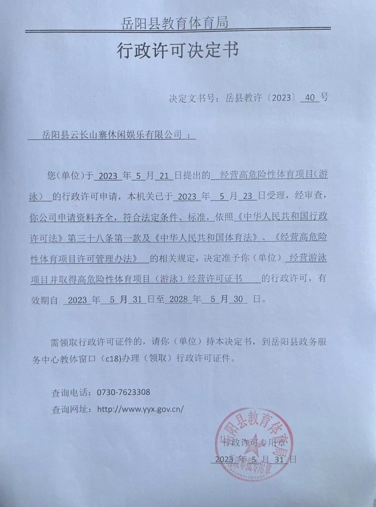 關於準予嶽陽縣雲長山寨休閑娛樂有限公司經營高危險性體育項目(遊泳)的許可決定