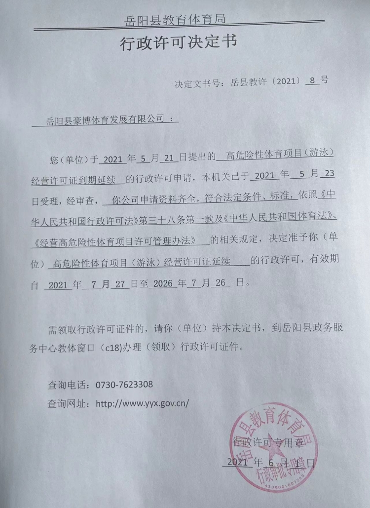 關於準予嶽陽縣豪博體育發展有限公司高危險性體育項目(遊泳)經營許可證到期延續的許可決定