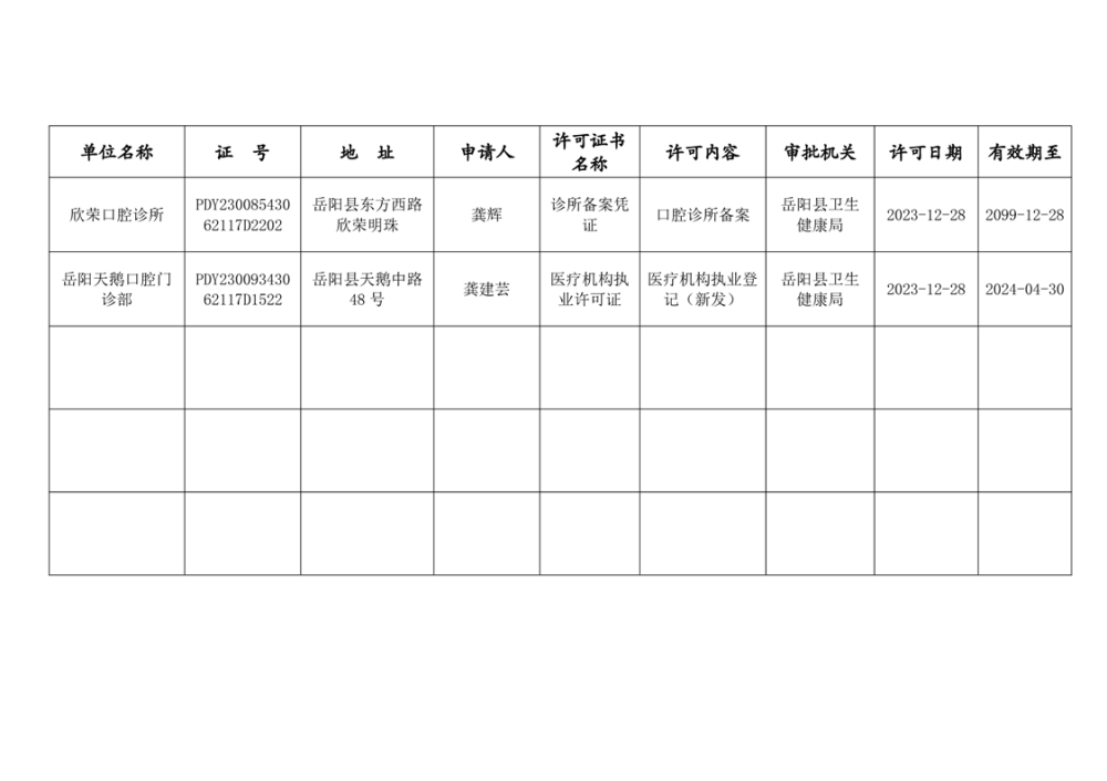 嶽陽縣衛生健康局2023年12月醫療機構執業許可公示
