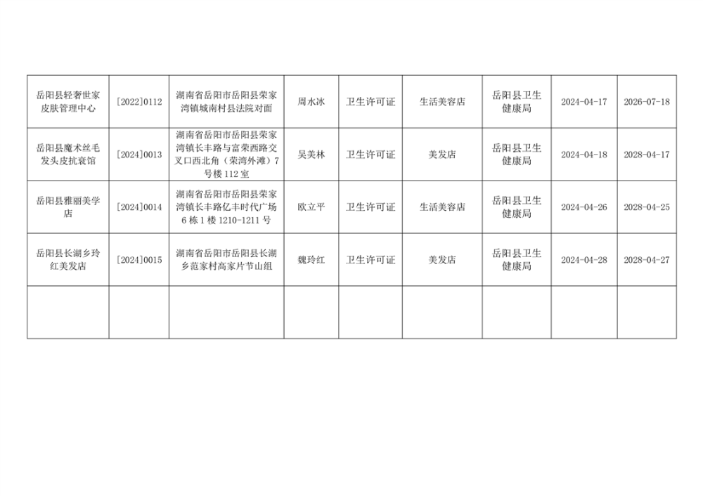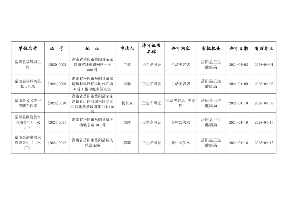 嶽陽縣衛生健康局2024年4月公共場所衛生許可公示