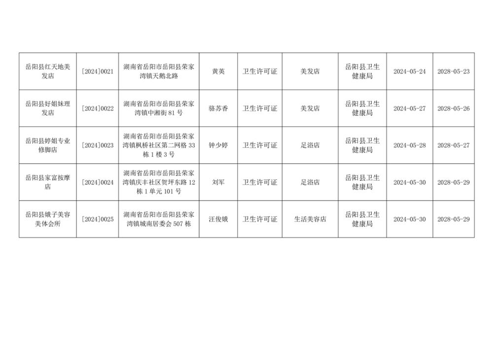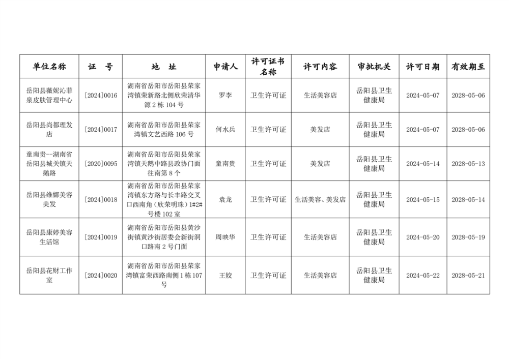 嶽陽縣衛生健康局2024年5月公共場所衛生許可公示