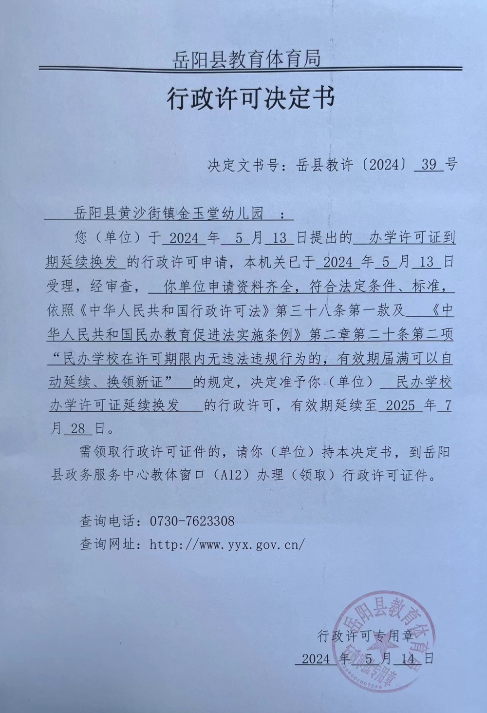 關於準予嶽陽縣黃沙街鎮金玉堂幼兒園辦學許可證到期延續的許可決定