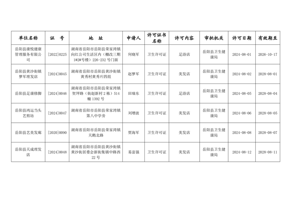 嶽陽縣衛生健康局2024年8月公共場所衛生許可公示