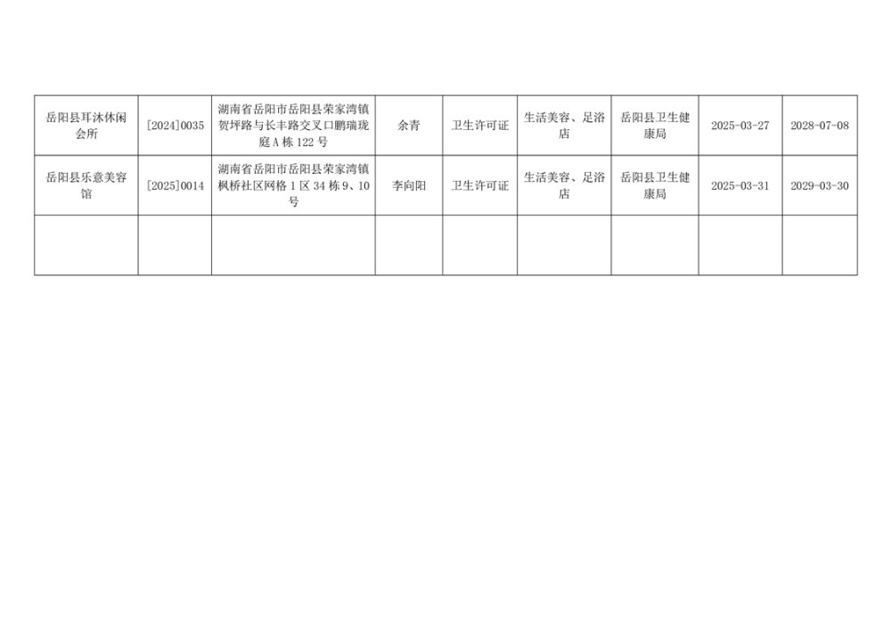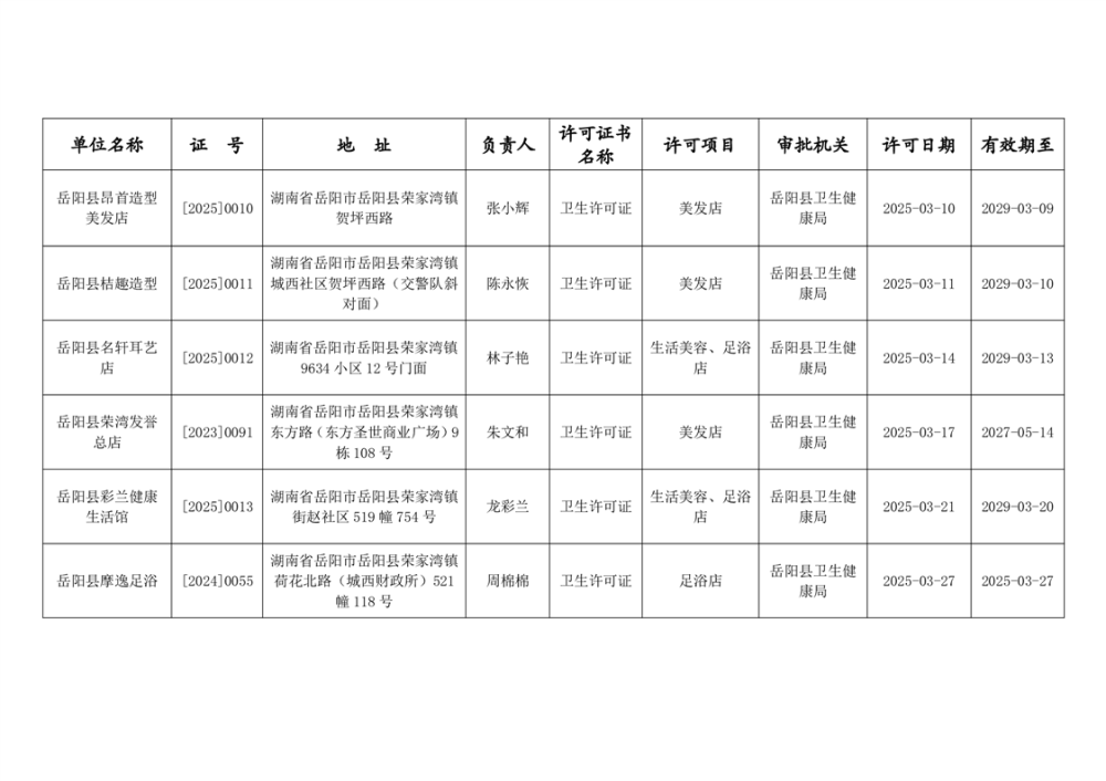 嶽陽縣衛生健康局2025年3月衛生許可公示