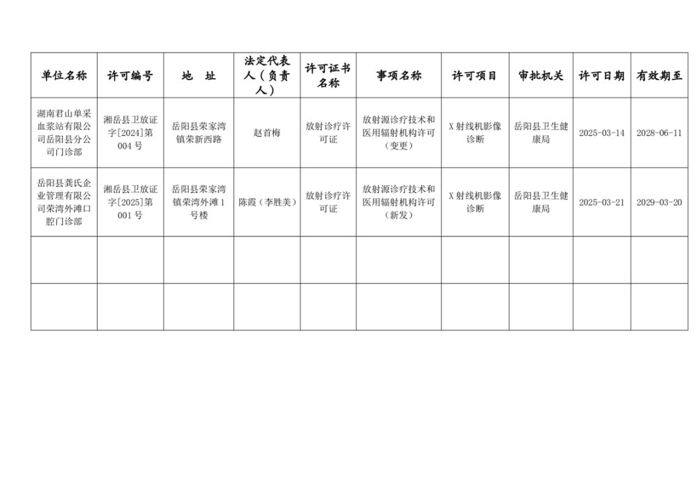 嶽陽縣衛生健康局2025年第一批放射診療許可公示