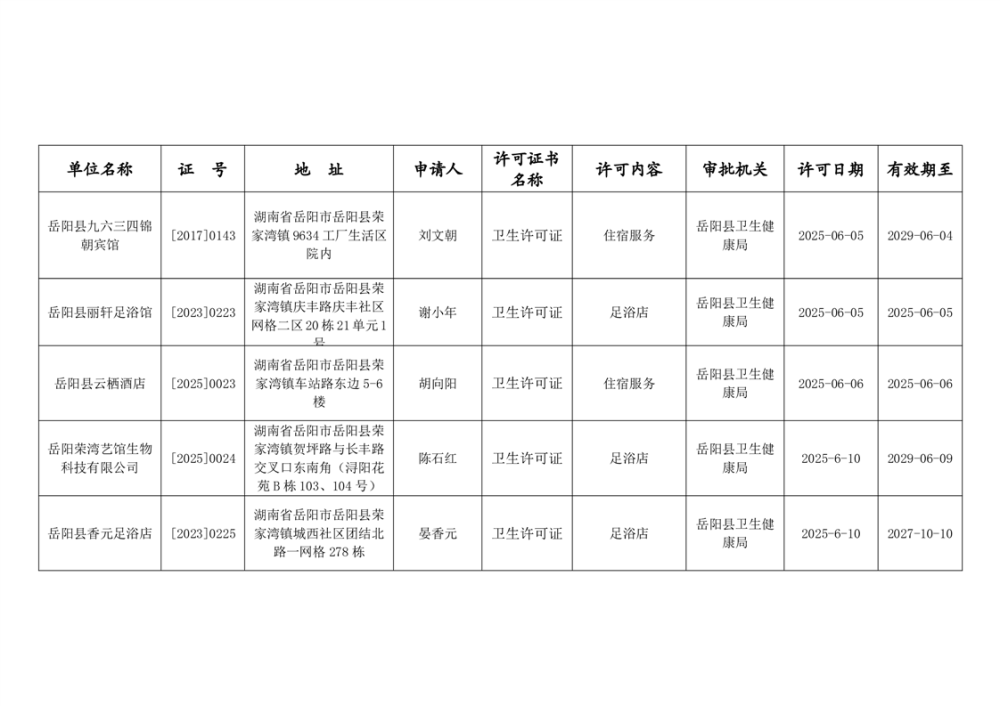 嶽陽縣衛生健康局2025年6月衛生許可公示