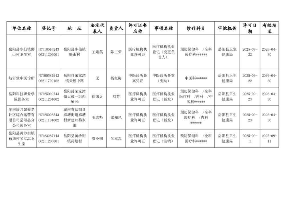 嶽陽縣衛生健康局2025年9月醫療機構執業許可公示