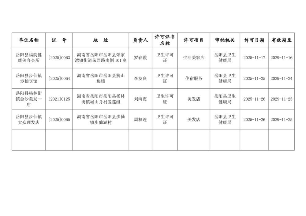 嶽陽縣衛生健康局2025年11月衛生許可公示