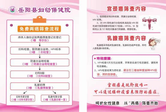 據了解,為提高廣大婦女群眾“宮頸癌、乳腺癌”(簡稱“兩癌”)早診、早治率,保護廣大婦女身心健康,嶽陽縣衛健局將“兩癌”篩查工作納入近期工作重點來抓,明確職責分工,組織縣婦幼保健院通過多種形式宣傳“兩癌”免費檢查,通過宣傳黨的惠民政策,張貼免費檢查通知、街道和各社區、村微信公眾號推送女性健康知識、入戶排摸,利用微信群等線上和線下相結合的方式,營造氛圍,向居民普及“兩癌”防治知識,強調“兩癌”篩查的必要性,引導適齡婦女積極參加“兩癌”免費篩查,使政府的惠民政策真正落到實處。
