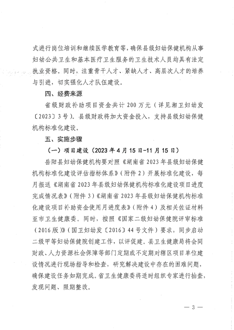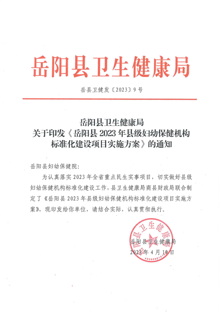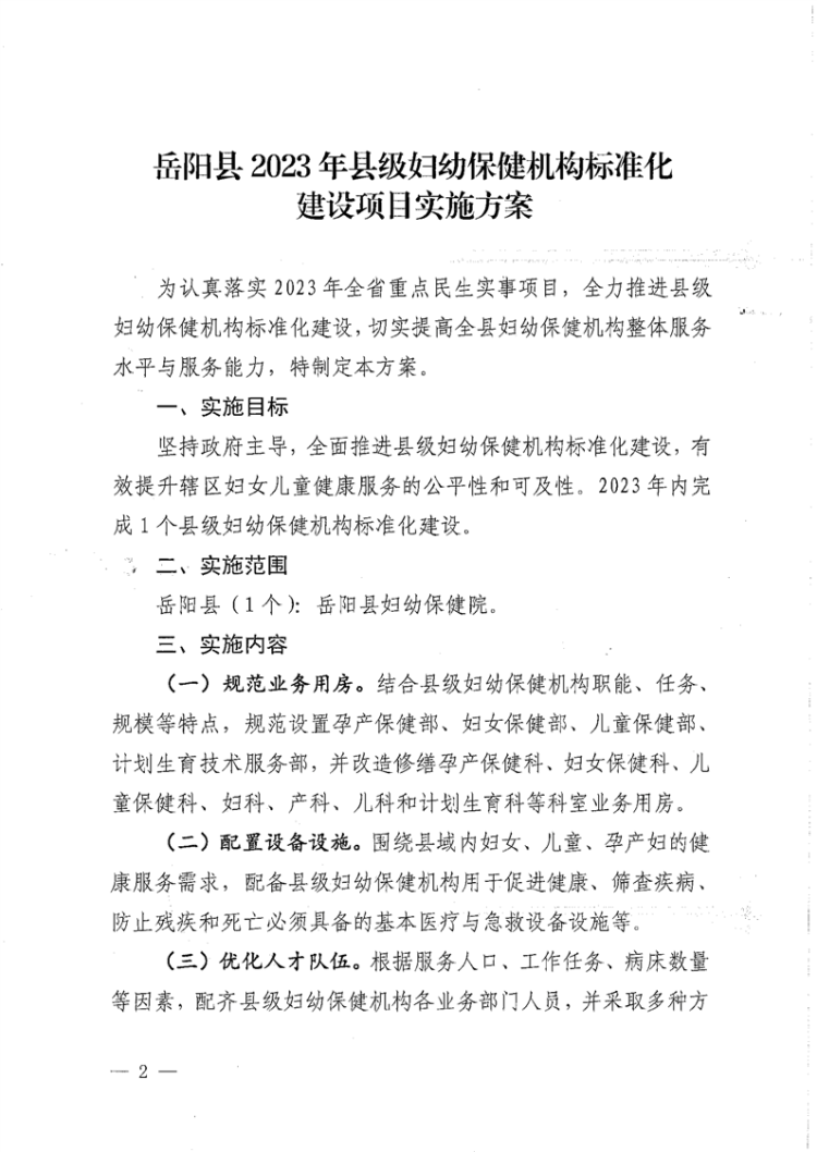 嶽陽縣2023年縣級婦幼保健機構標準化建設項目實施方案