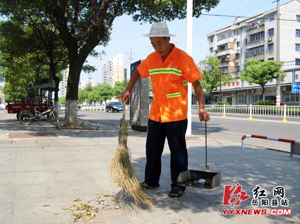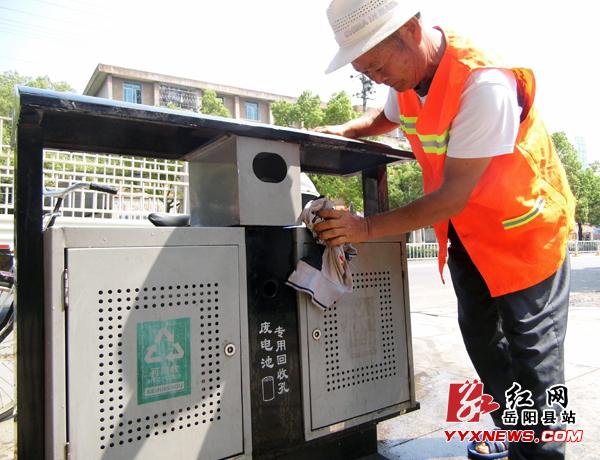 紅網嶽陽縣站8-15訊(本站記者 吳擁民 彭會)8-13上午10時,強烈的光刺得人睜不開眼睛,裸露的皮膚在陽光下被灼得陣陣刺痛。烈下,樹蔭半遮半漏的的垃圾桶邊,一個蹲著的橙色身影正用抹布吃力的擦拭著桶身的汙垢,黝黑的臉上布滿了密密的汗珠。眼看著剛奮力擦過的一邊桶身漸漸露出了它本來的光潔容貌,李振龍滿意的笑了笑,將清洗球上的汙漬在身邊水桶中搓洗幹淨後,蘸上些袋中的洗衣粉,又擦上了另一邊。