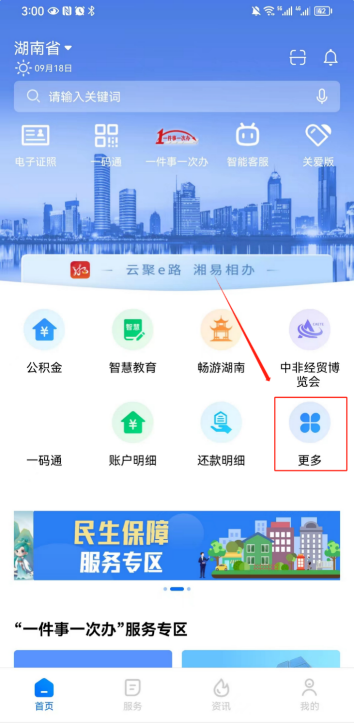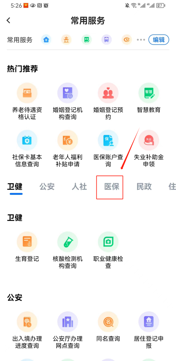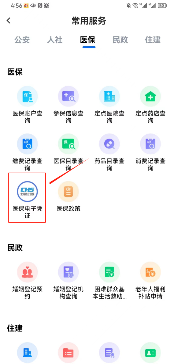 第二步:在首頁功能區點擊“更多”,在常用服務裏選擇“醫保”分類選項,就可以找到“醫保電子憑證”功能入口了!